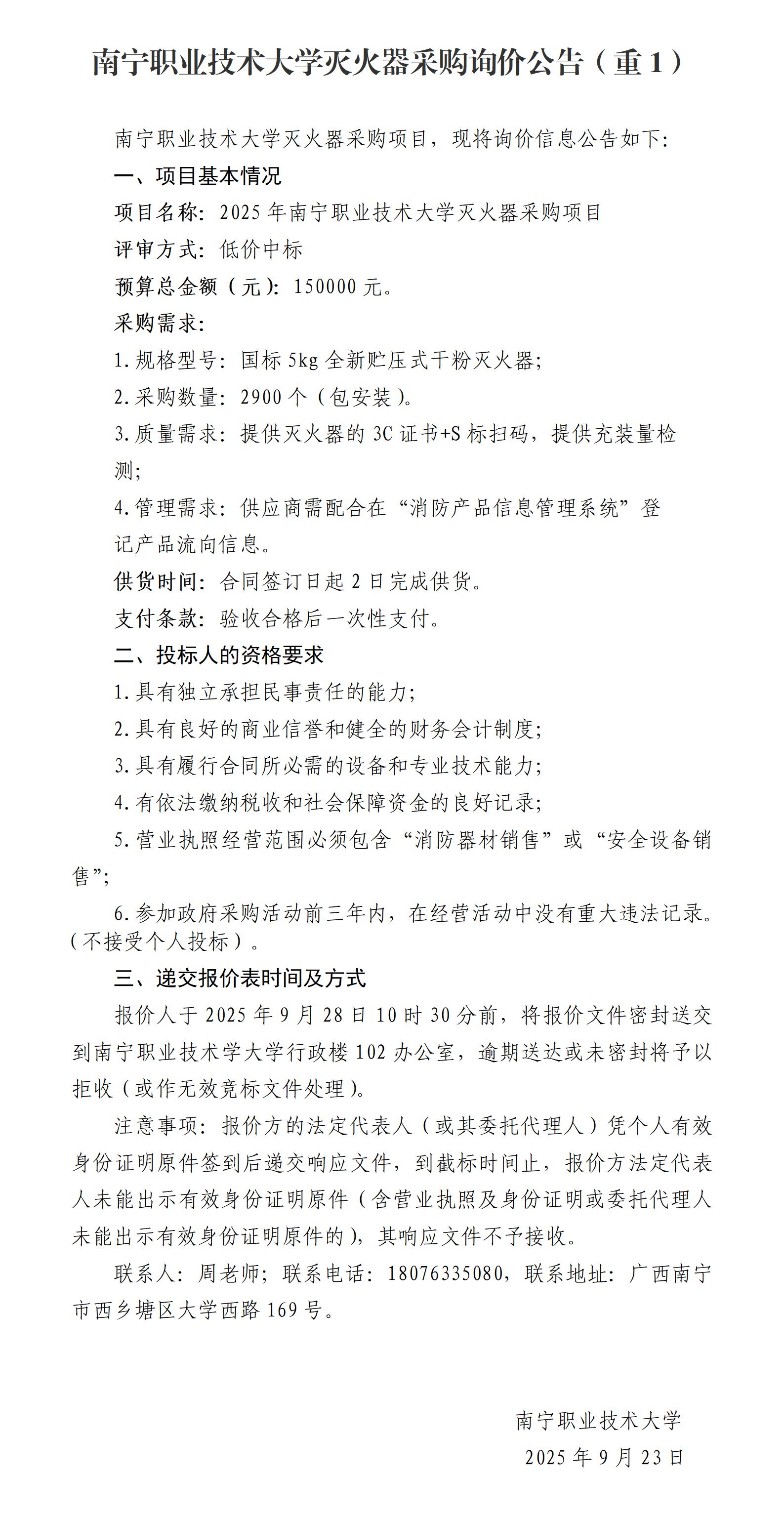 上一条: 南宁职业技术大学2025秋季开学五金维修零星耗材采购公告(重)
