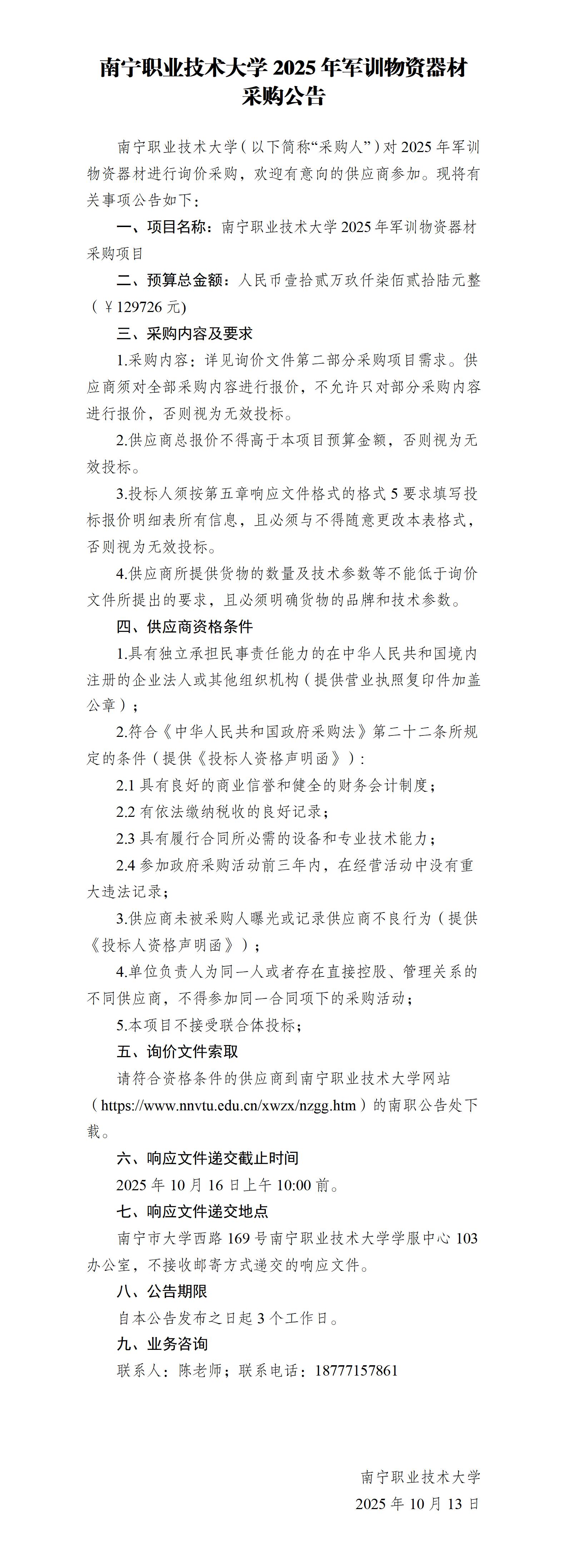 上一条: 南宁职业技术大学2025年军训物资器材租赁公告