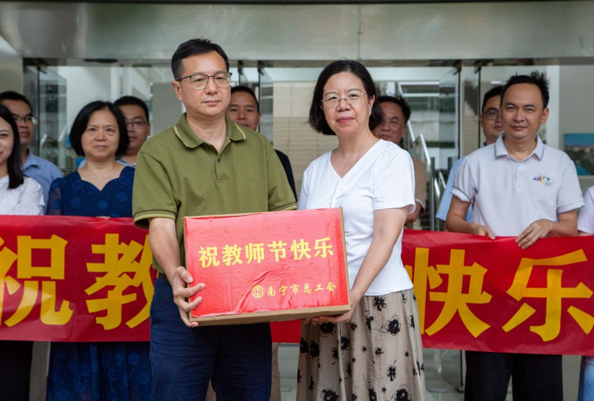9月8日,在第41个教师节来临之际,南宁市总工会四级调研员丁维一行到我校开展教师节慰问活动,向坚守教育一线的教师们致以节日祝福与诚挚问候。