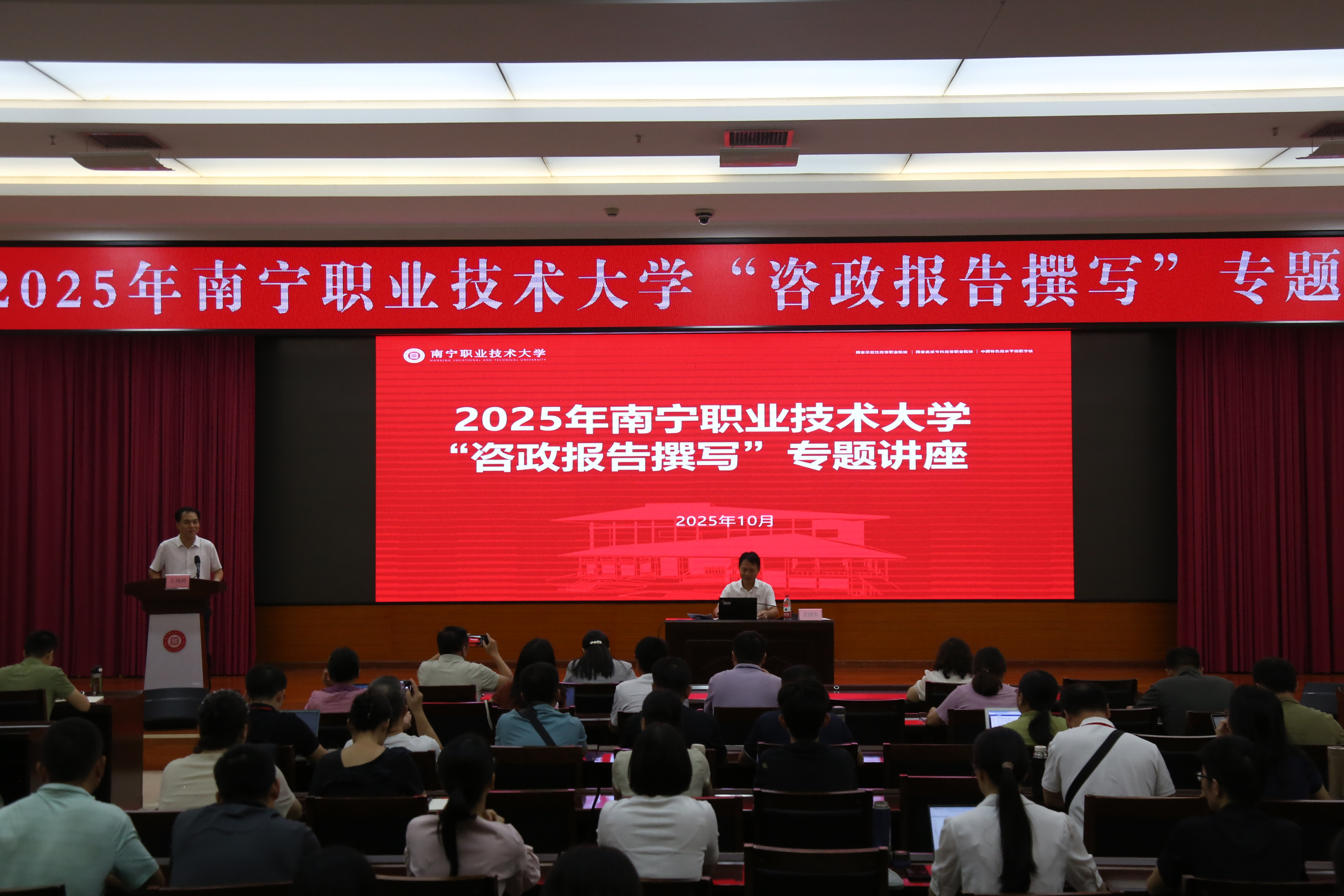 王凤岭在致辞中表示,学校始终高度重视咨政研究工作,希望参会教师珍惜学习机会,认真汲取实务经验,把学术专长同南宁发展需求紧密结合,力争产出更多高质量、可转化、可落地的咨政成果,为学校打造特色新型智库、服务南宁经济社会高质量发展贡献南职力量。