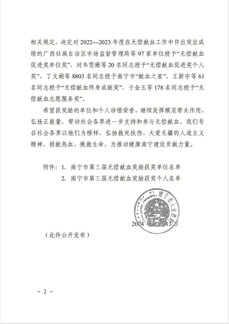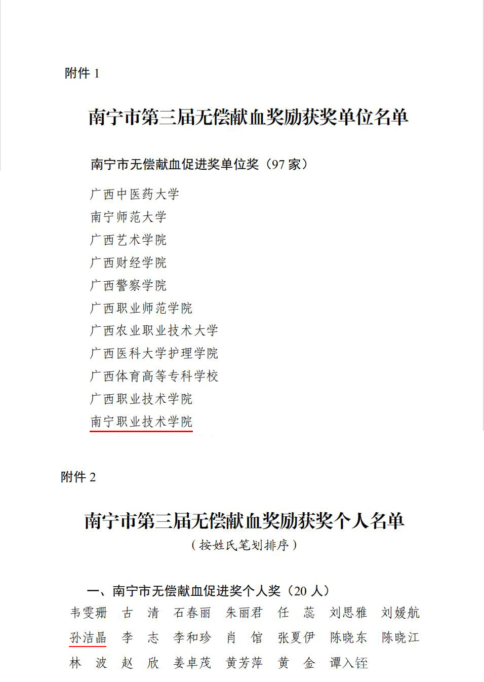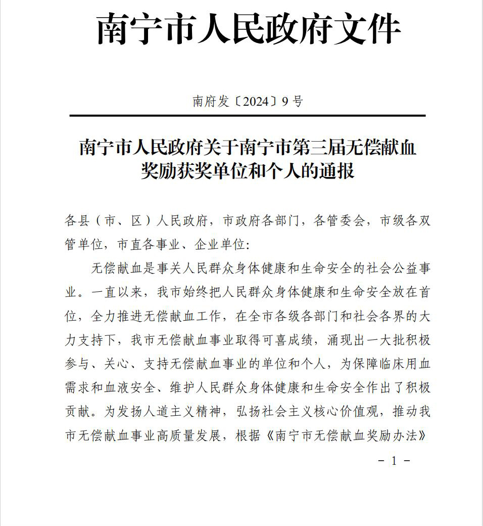 近日,南宁市政府发布了《南宁市人民政府关于南宁市第三届无偿献血奖励获奖单位和个人的通报》,我校获南宁市无偿献血促进奖单位奖,其中孙洁晶同志获无偿献血促进奖个人奖。