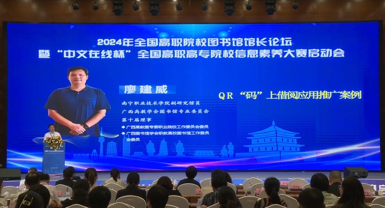 廖建威在会上作了分享交流,主要汇报了以广西地区高职院校图书馆为代表的纸本文献与数字文献建设常见痛点及难点,并重点对业务管理环节中利用二维码技术精准定位,流通借阅结构再造,RFID系统数据应用等进行了经验分享。