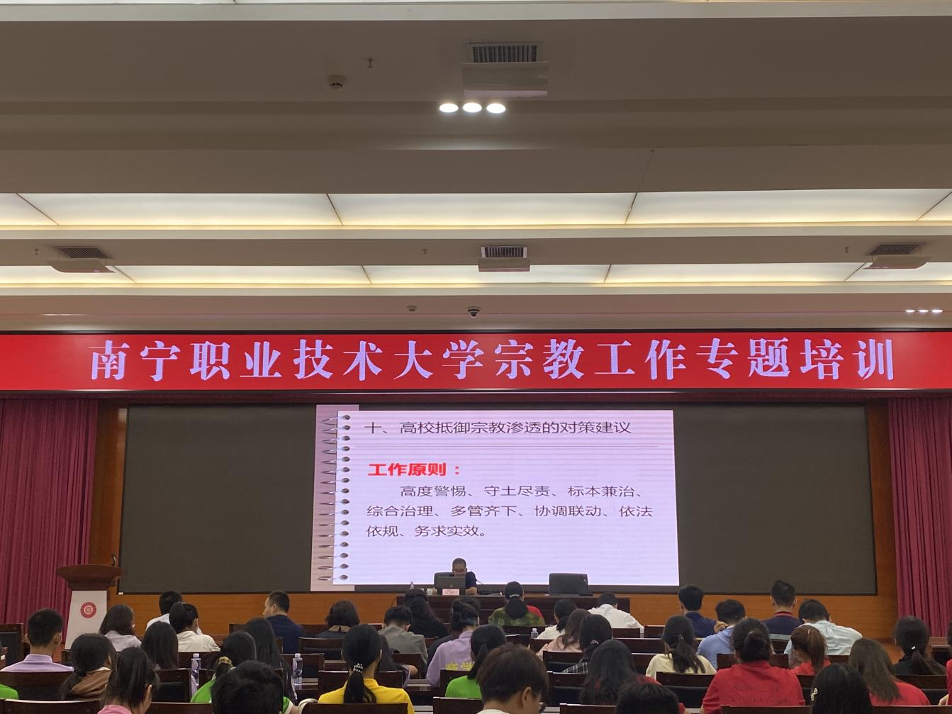 10月23日上午,我校在会议中心二号厅举办宗教工作专题培训。自治区民宗委原副主任、自治区讲师团特聘专家梁柳宁受邀作题为《高校抵御渗透和防范校园传教工作存在问题及对策建议》的专题讲座。