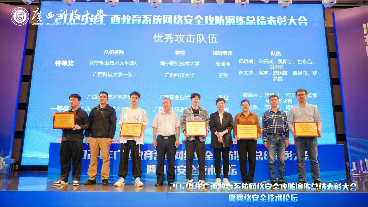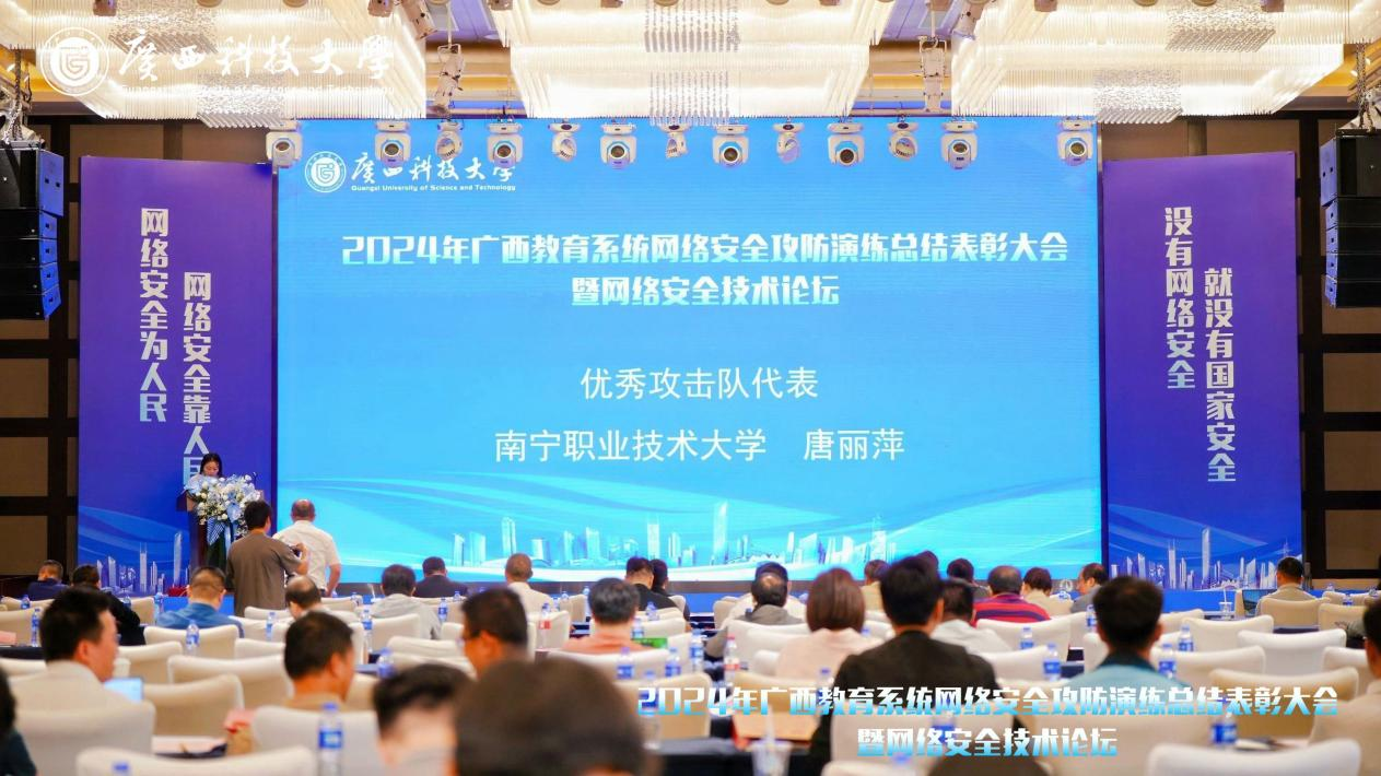 10月25日,2024年广西教育系统网络安全攻防演习总结表彰大会暨网络安全技术论坛在柳州顺利召开。本次广西教育网络安全攻防演习共有76支高校攻击队和175所高校及区直中职学校的防守队参加,我校教育发展与信息服务中心(图书馆)联合人工智能学院组队派出的南宁职业技术大学2队荣获优秀攻击队伍特等奖、南宁职业技术大学1队荣获优秀攻击队伍二等奖,队伍指导老师唐丽萍作为优秀攻击队代表上台作经验交流分享。