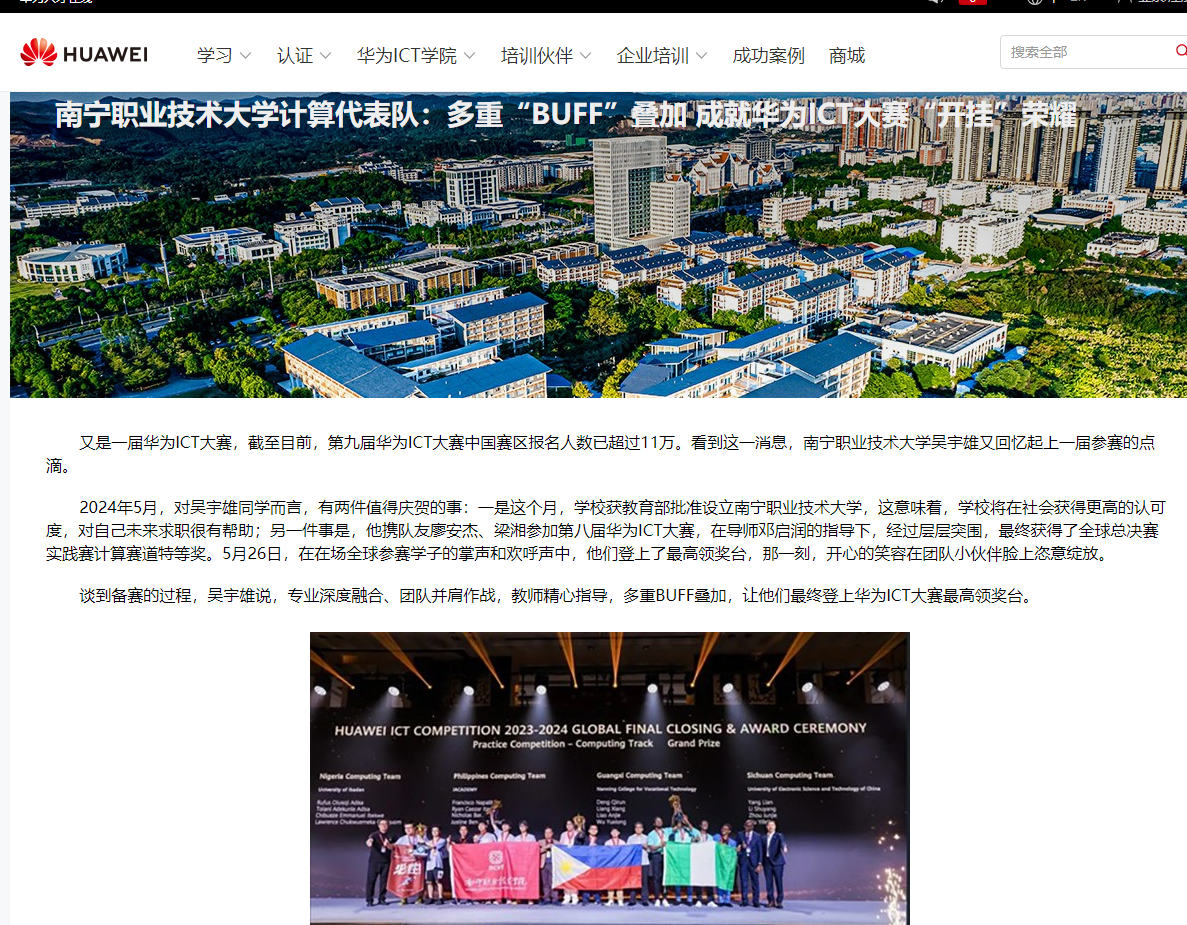 2024年5月,对吴宇雄同学而言,有两件值得庆贺的事:一是这个月,学校获教育部批准设立南宁职业技术大学,这意味着,学校将在社会获得更高的认可度,对自己未来求职很有帮助;另一件事是,他携队友廖安杰、梁湘参加第八届华为ICT大赛,在导师邓启润的指导下,经过层层突围,最终获得了全球总决赛实践赛计算赛道特等奖。5月26日,在在场全球参赛学子的掌声和欢呼声中,他们登上了最高领奖台,那一刻,开心的笑容在团队小伙伴脸上恣意绽放。