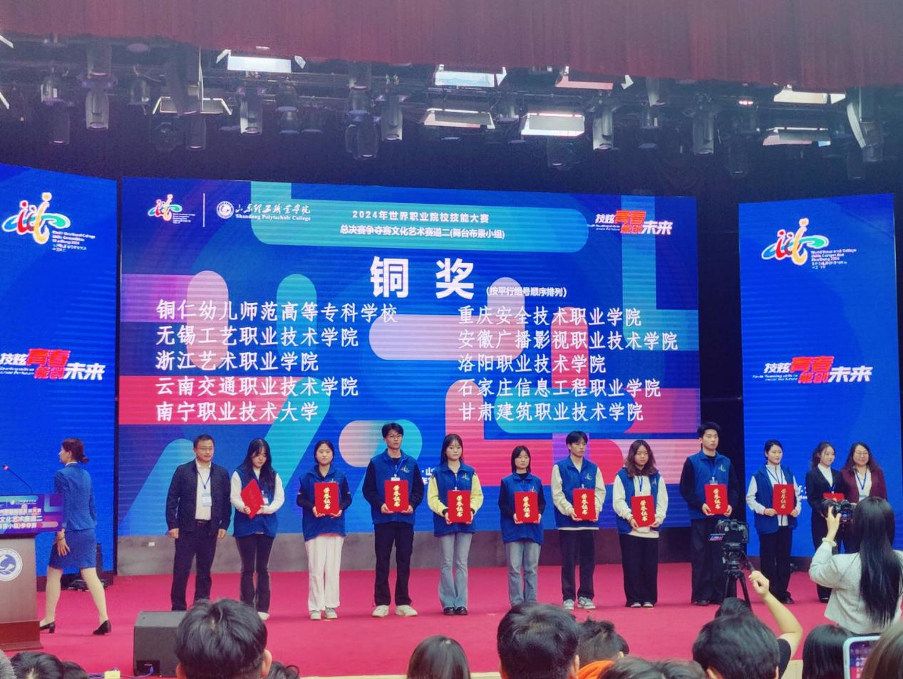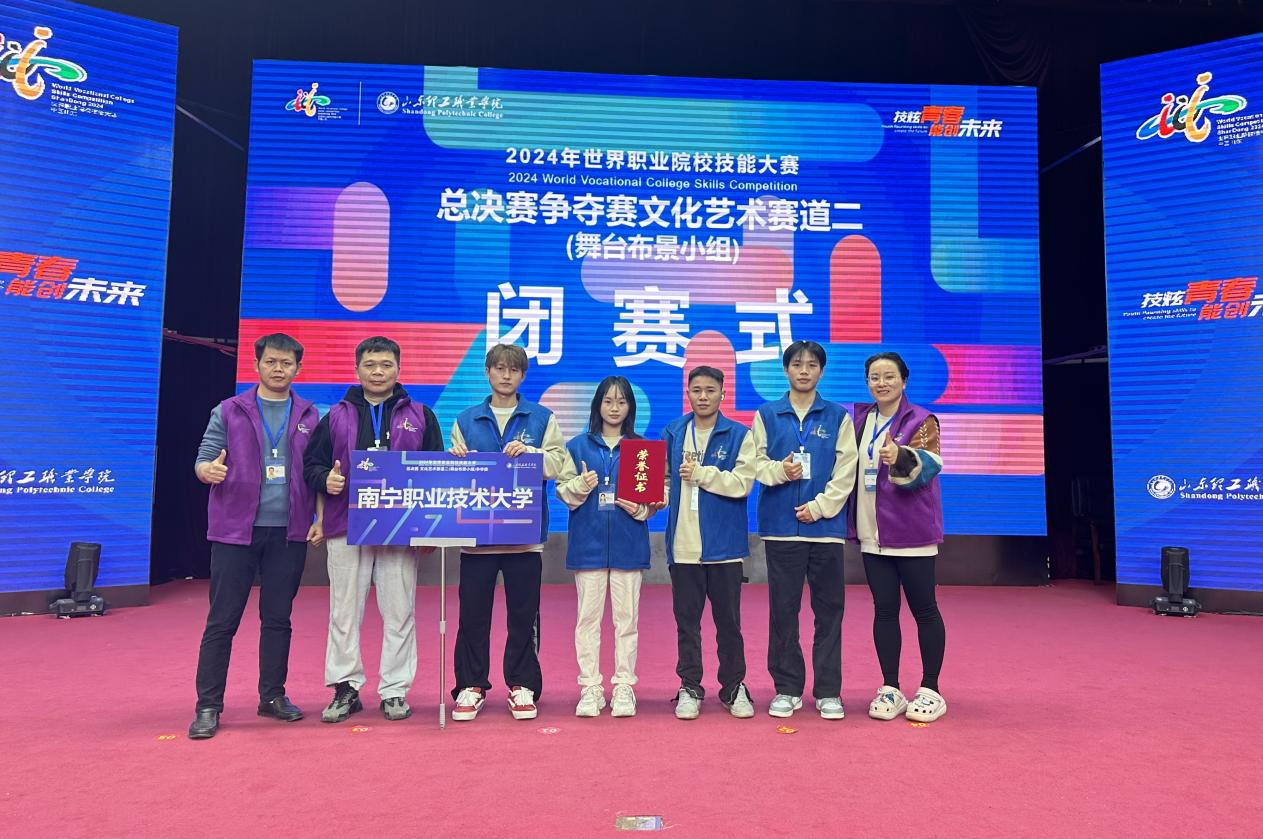 10月30日,2024年世界职业院校技能大赛《舞台布景》赛项在山东济宁落下帷幕。由我校室内艺术设计专业教师刘冰、数字媒体艺术设计专业教师刘明理指导,室内艺术设计专业学生李金亮、李文明,数字媒体艺术设计专业学生杨菲菲,环境艺术设计专业学生李世平跨专业组成的参赛队伍,在总决赛争夺赛中以小组第三名的成绩斩获铜奖,成为广西唯一一支获奖队伍。