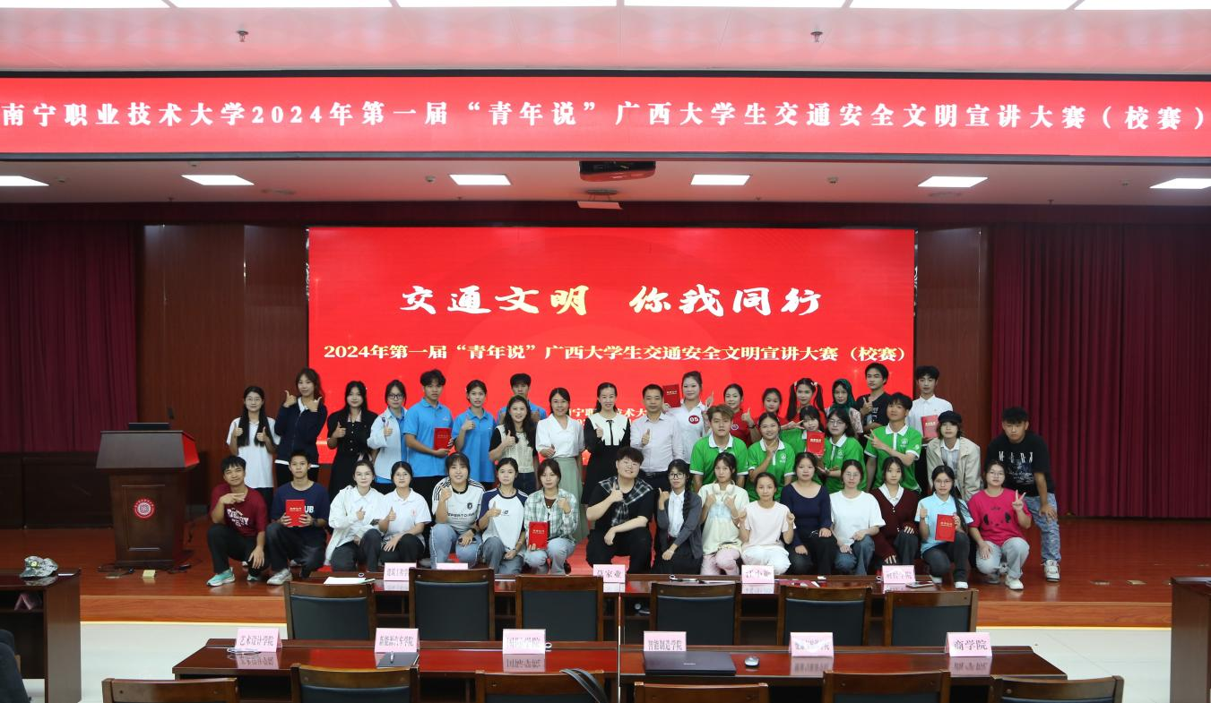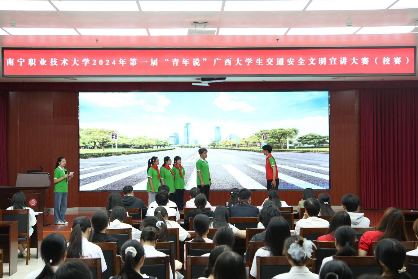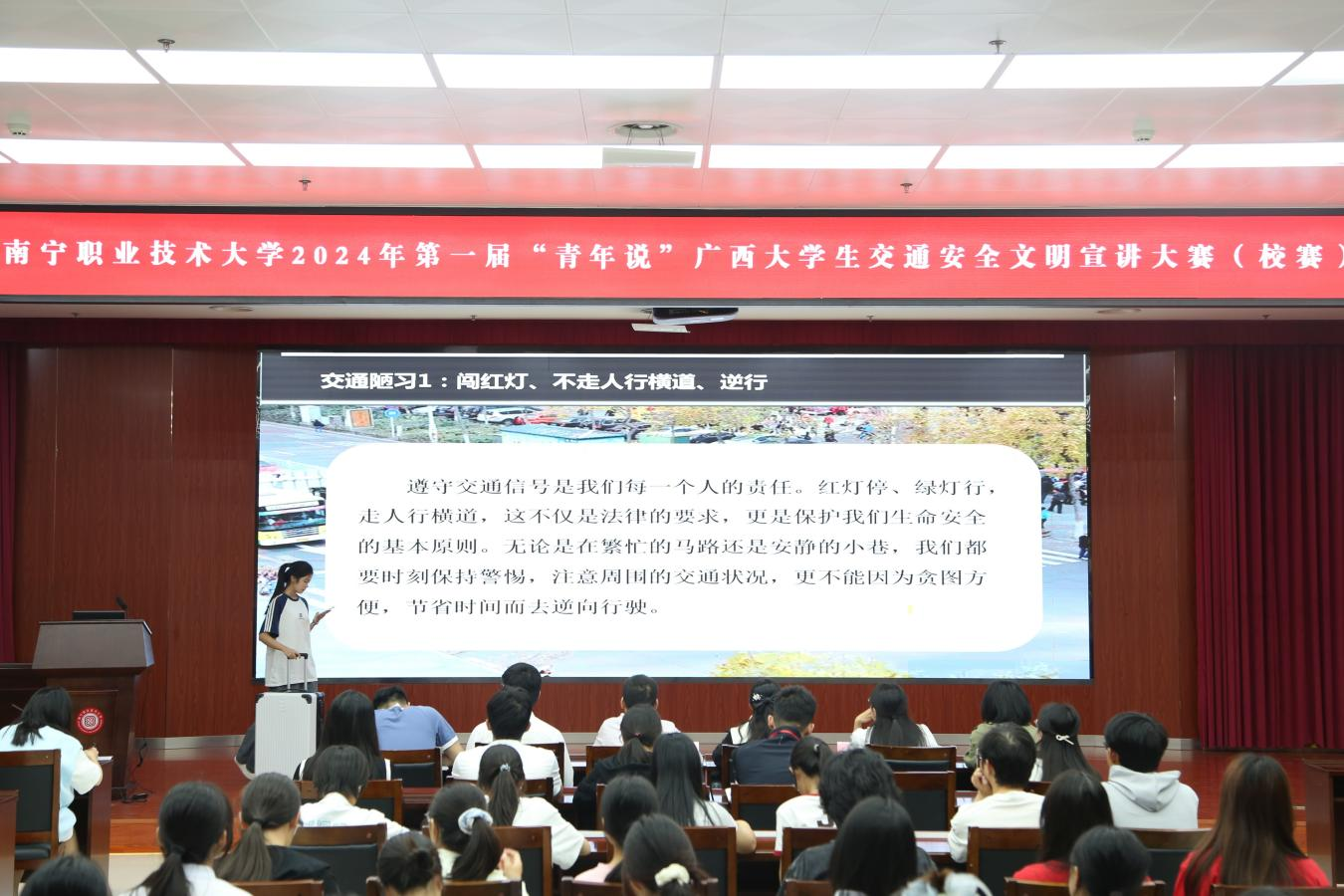 为推动广西交通安全文明建设持续健康发展,锻造青年学生的使命感、责任感、归属感、荣誉感,11月8日,由校团委主办、校翰林与演讲口才协会承办的2024年第一届“青年说”广西大学生交通安全文明宣讲大赛(校赛)在我校会议中心三号厅顺利举行。校团委书记孙洁晶,学生工作部(武装部、学生工作处)副部(处)长莫家业,党委宣传部老师江小艳,各学院团委教师代表、参赛选手以及学生代表共计180余人参加本次比赛。