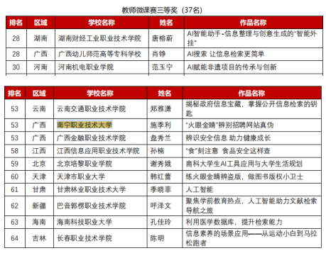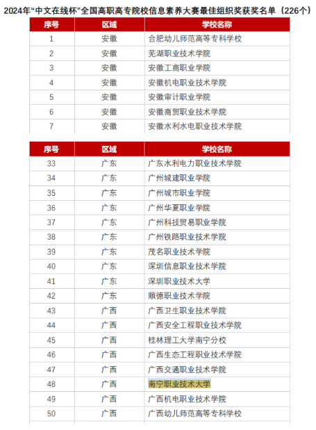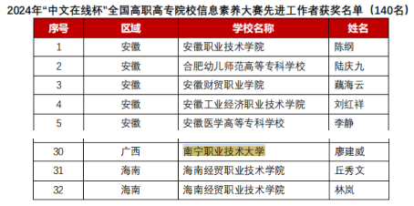 12月11日,“中文在线杯”2024年全国高职高专院校信息素养大赛获奖名单公布,我校获最佳组织奖。施季利获决赛教师微课赛三等奖。廖建威获先进工作者称号。