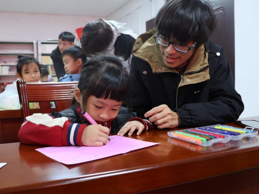 志愿者指导小朋友绘画(钟炎文/摄)