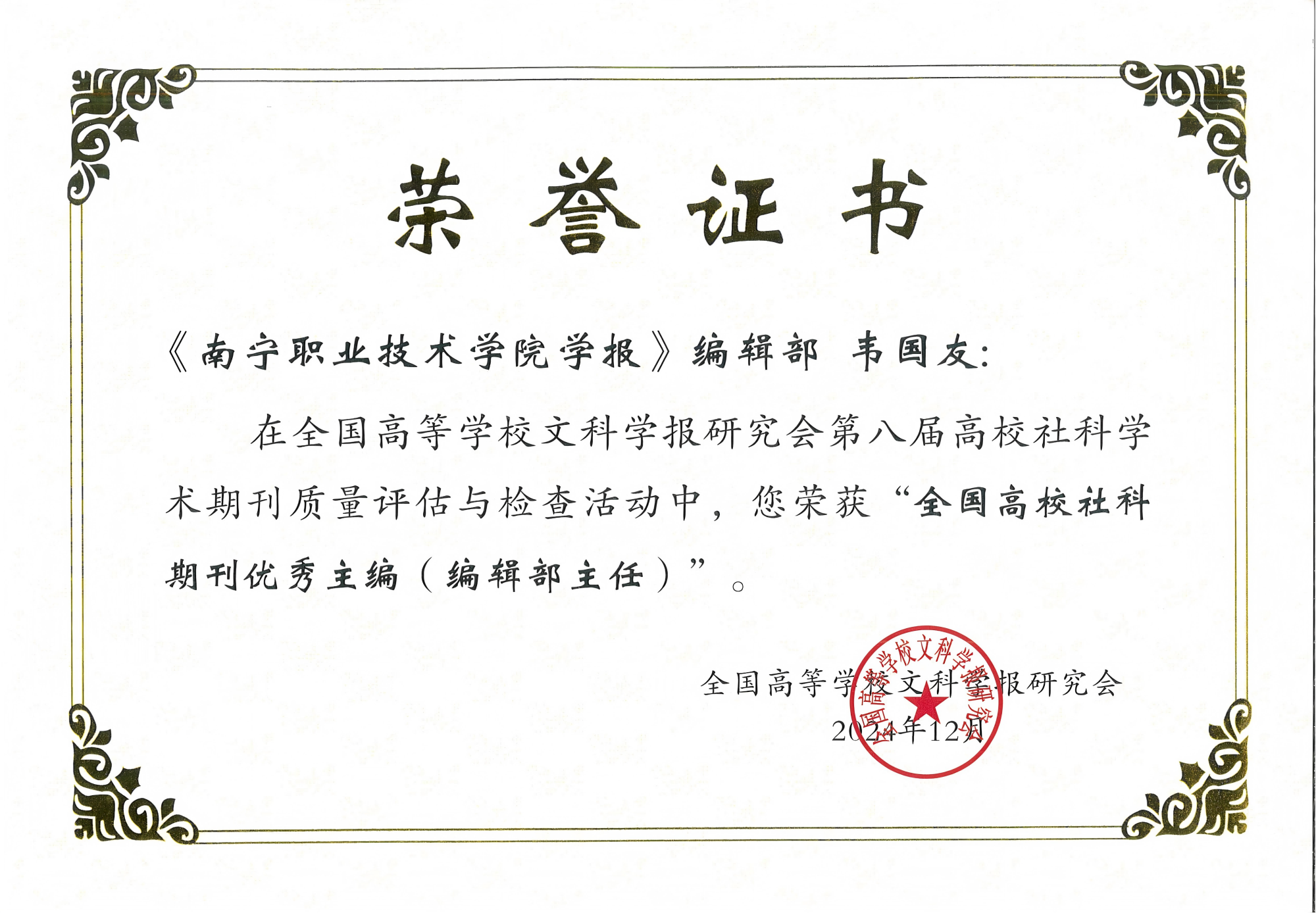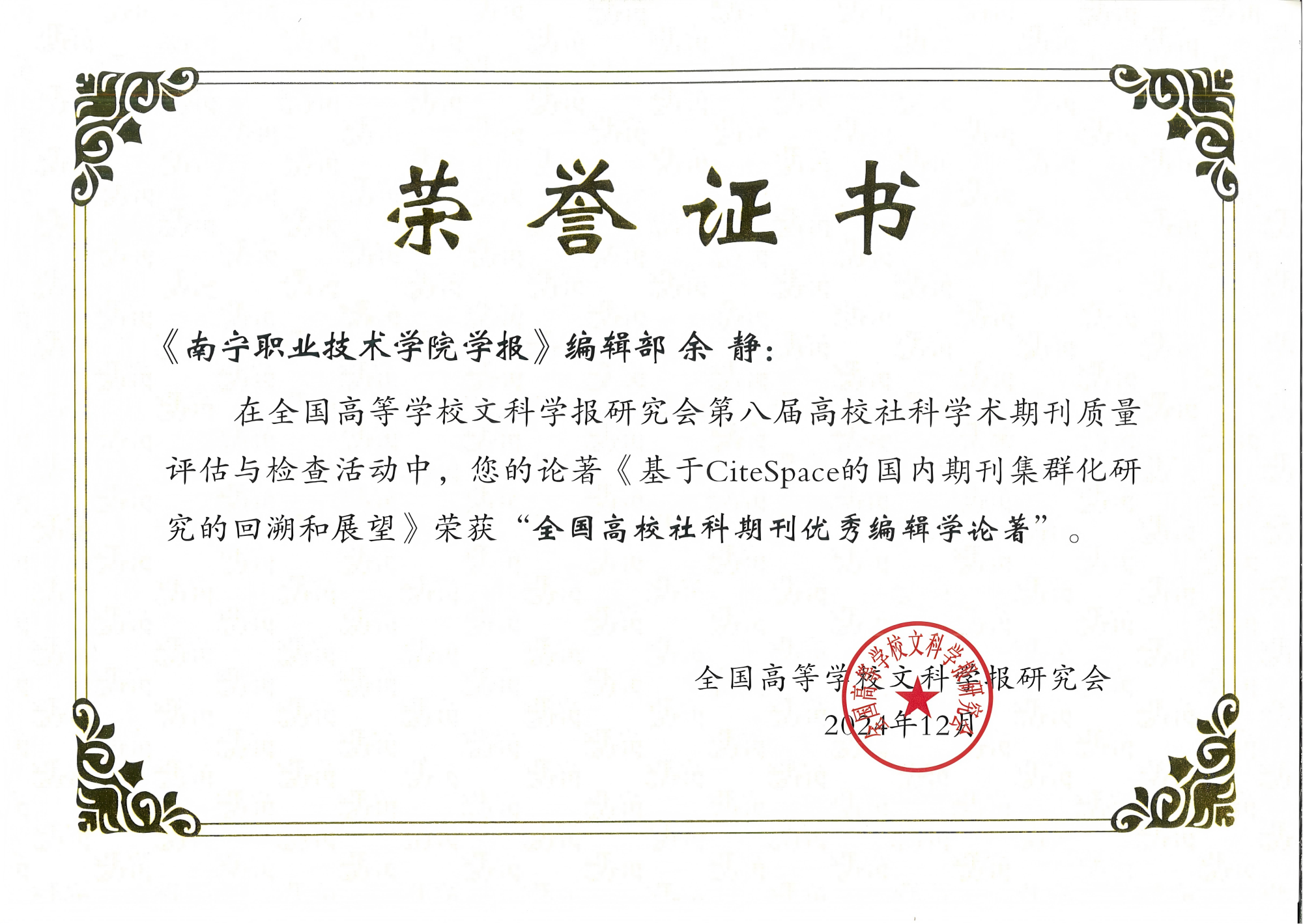 近日,全国高等学校文科学报研究会第八届高校社科期刊质量评估与检查活动结果公示,《南宁职业技术学院学报》编辑部韦国友荣获“全国高校社科期刊优秀主编”,余静撰写的论文《基于CiteSpace的国内期刊集群化研究的回溯和展望》荣获“全国高校社科期刊优秀编辑学论著”。