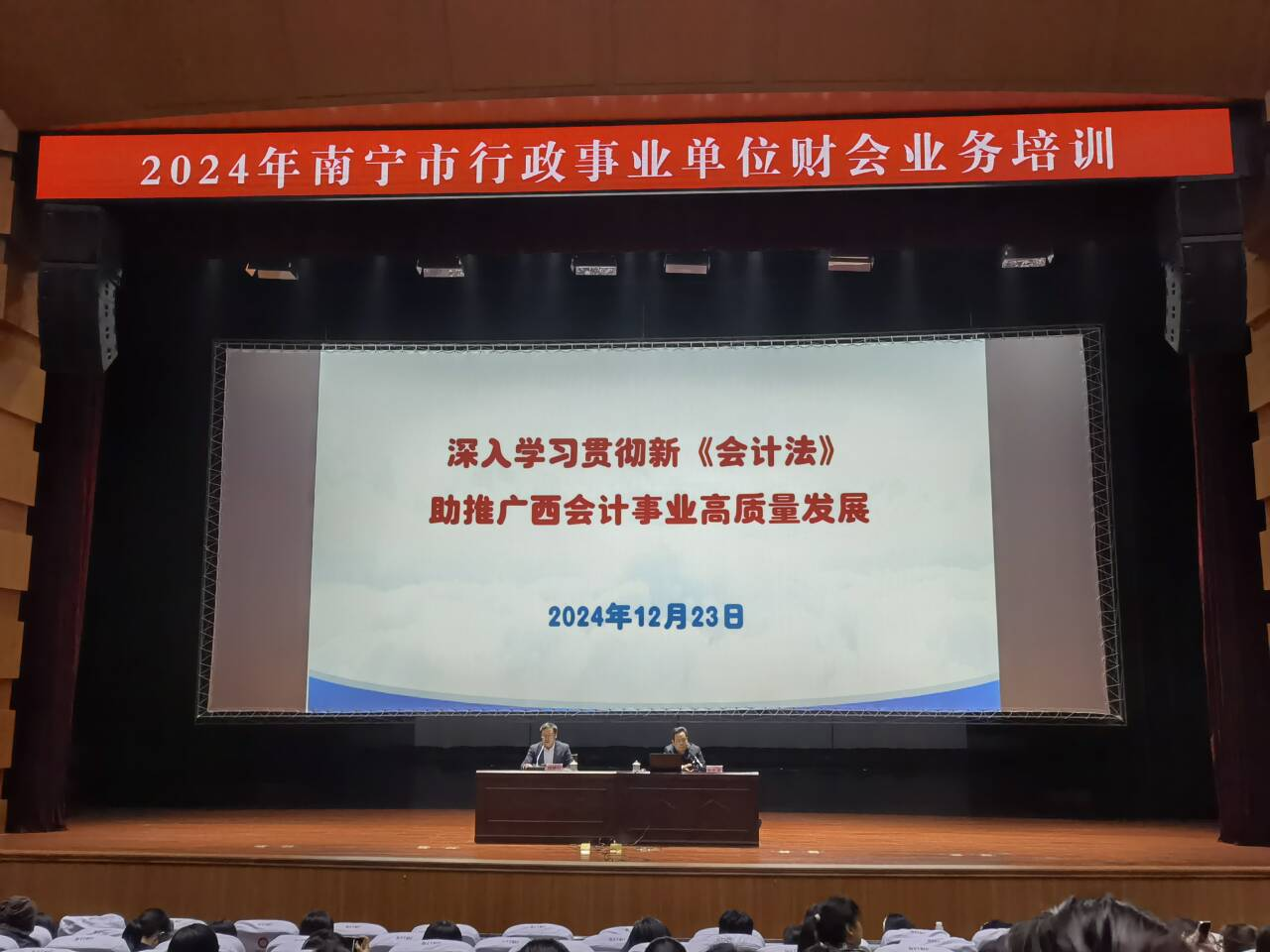 12月23日,由南宁市财政局举办、南宁职业技术大学协办的南宁市行政事业单位财会业务培训班在我校顺利开班。广西财政厅会计管理处处长黄高留,南宁市财政局会计管理科科长杨德强,广西财经学院翟晓龙教授以及全市行政事业单位财会人员等共计800人参加培训。