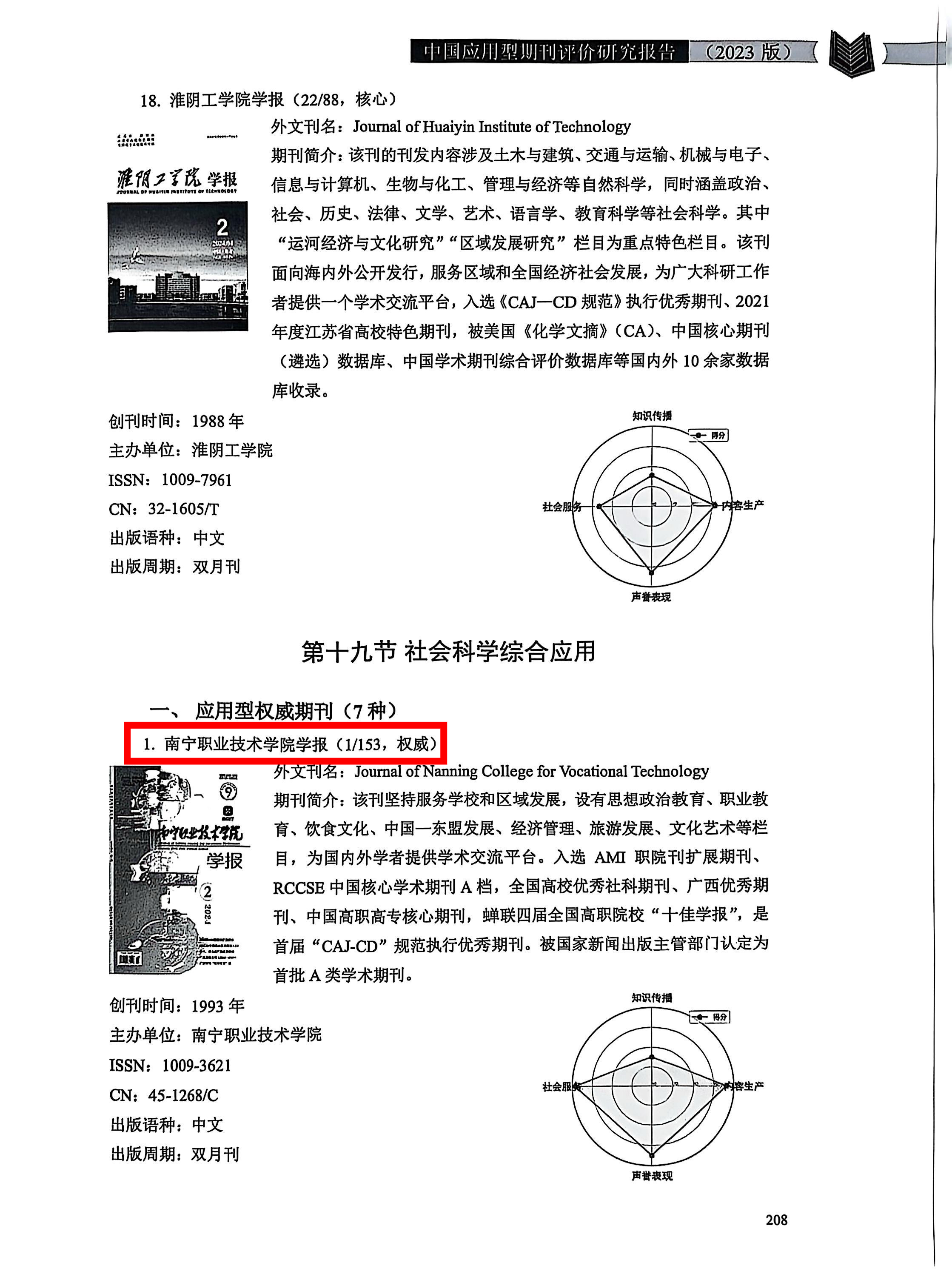 近期,图书《中国应用型期刊评价研究报告(2023版)》由天津科技出版社出版发行。该书详细介绍了中国应用型期刊的评价目的、意义与特色、评价方案、指标体系、数据来源、处理方法、计算方式、结果呈现等,并列出了中国应用型期刊评价排行榜,共有1365种期刊进入榜单。应用型期刊主要以应用实践为定位,关注和刊载以反映技术开发、工程应用、职业发展、行业实践或社会实践问题等内容为主,是与理论型期刊相对的概念。应用型期刊评价更注重国家和领域实际问题的实践应用评价,与行业知识传播和应用、职业技术教育和技能人才培养等紧密相关,直接关联社会经济和新质生产力发展。根据评价标准,中国应用型期刊分为权威期刊、核心期刊、扩展期刊、入库期刊4个等级。书中展示了应用型期刊在内容生产、知识传播、社会服务、声誉表现等方面的突出表现,《南宁职业技术学院学报》的定量评价与定性评价综合得分较高,在全国153家“社会科学综合应用”类期刊中排名第一。