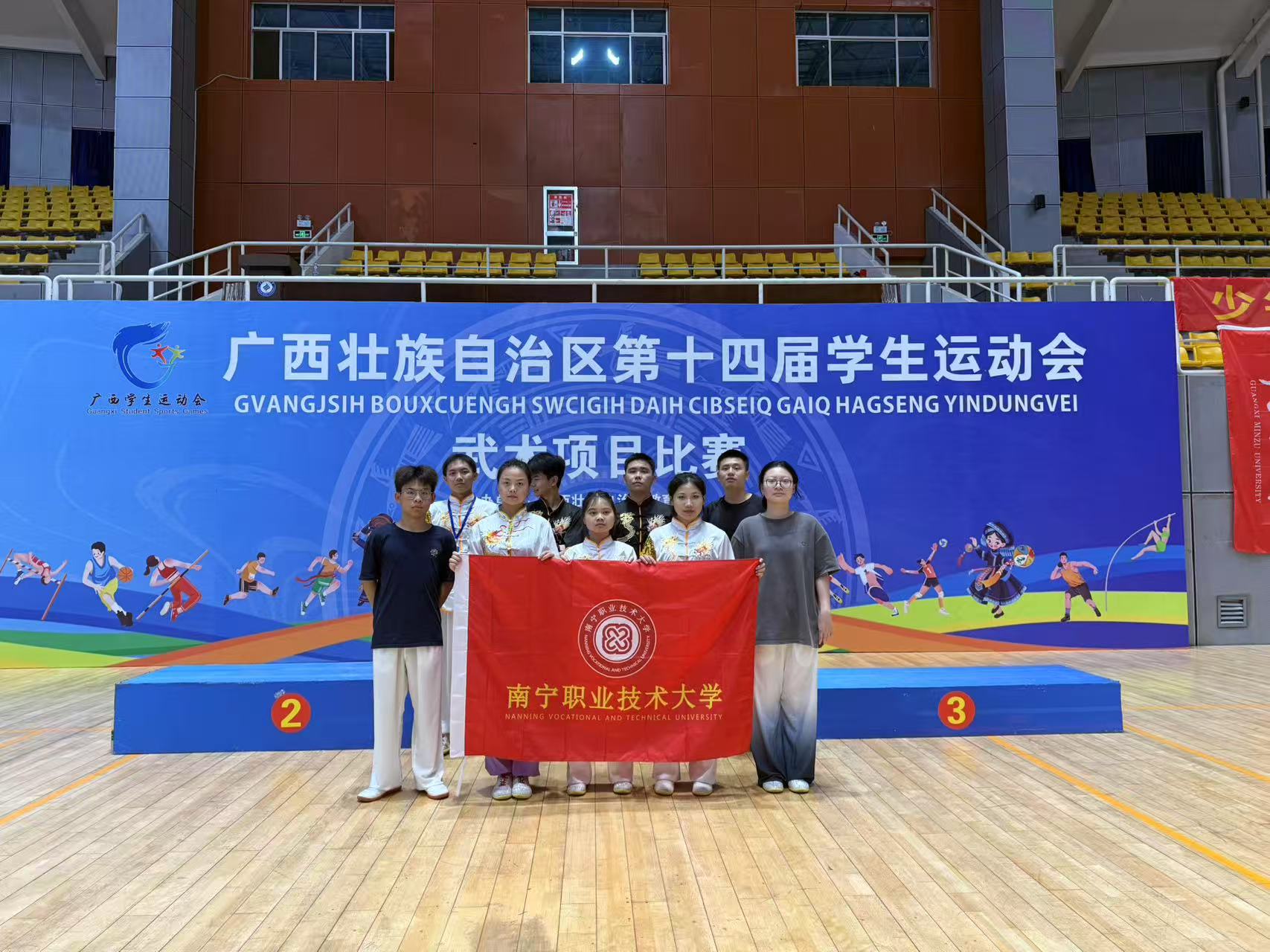 广西第十四届学生运动会由自治区教育厅、自治区体育局和共青团广西区委联合主办,是全区学生广泛参与的综合性体育盛会。本届学生运动会共设11个大项、305个小项,共有来自全区14个设区市、81所高校及25所区直中等职业学校的运动健儿报名参赛,运动员、教练员、志愿者等总规模超过2万人,参赛单位数量及参赛人数均创历史新高。我校高度重视此次比赛,共派出由17名指导教师及140名学生运动员组成的一支充满活力的参赛队伍,参与了篮球、足球、排球、乒乓球、羽毛球、田径、游泳、啦啦操、武术、绣球和毽球等11个项目的角逐。