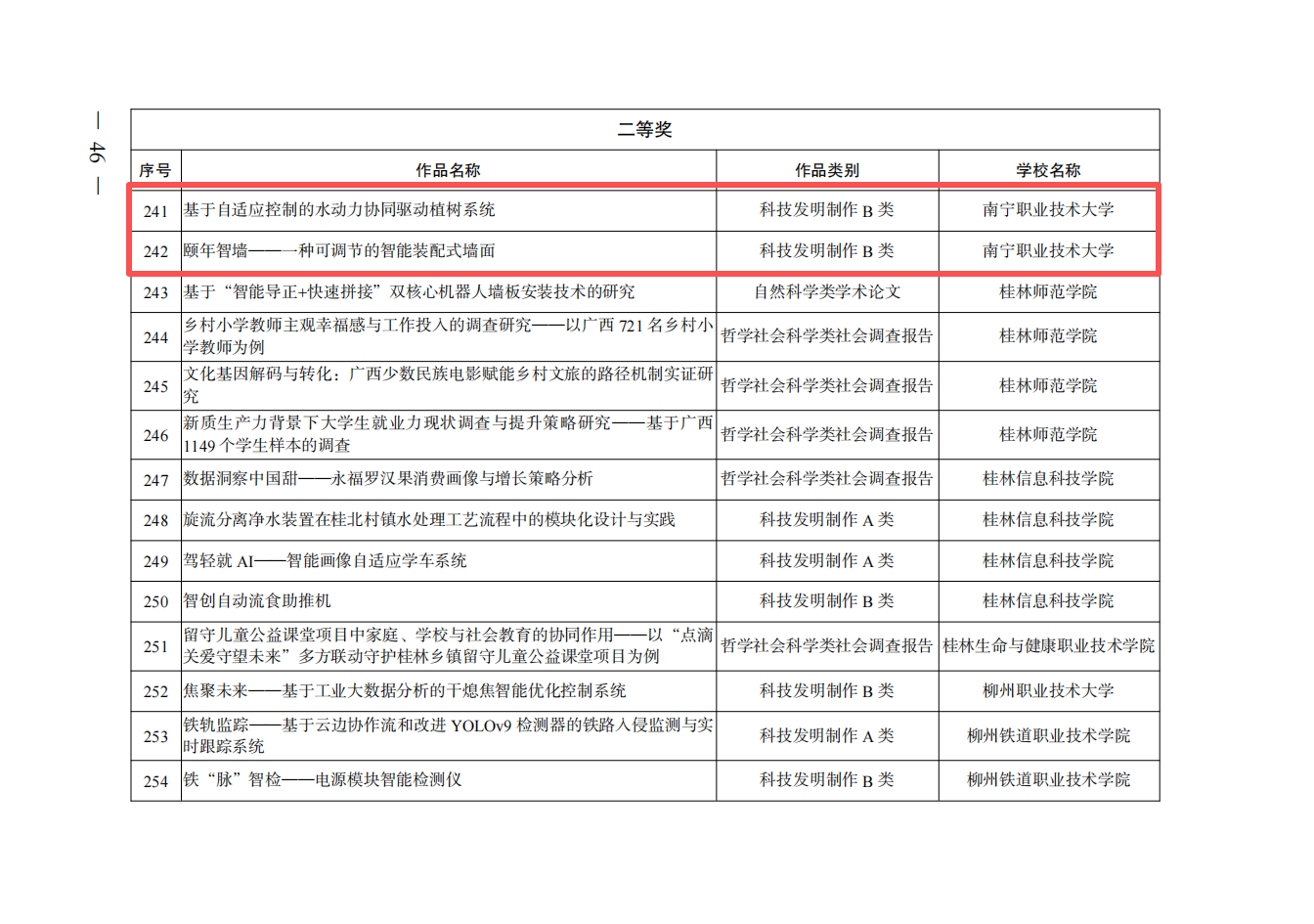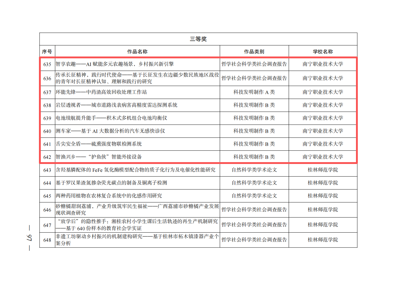近日,共青团广西区委、自治区教育厅、自治区科协、广西学联公布第十二届“挑战杯”广西大学生课外学术作品科技竞赛获奖名单。我校共有27项参赛作品获奖,其中特等奖2项、一等奖7项、二等奖7项、三等奖11项,学校荣获“优胜杯”和“优秀组织奖”。