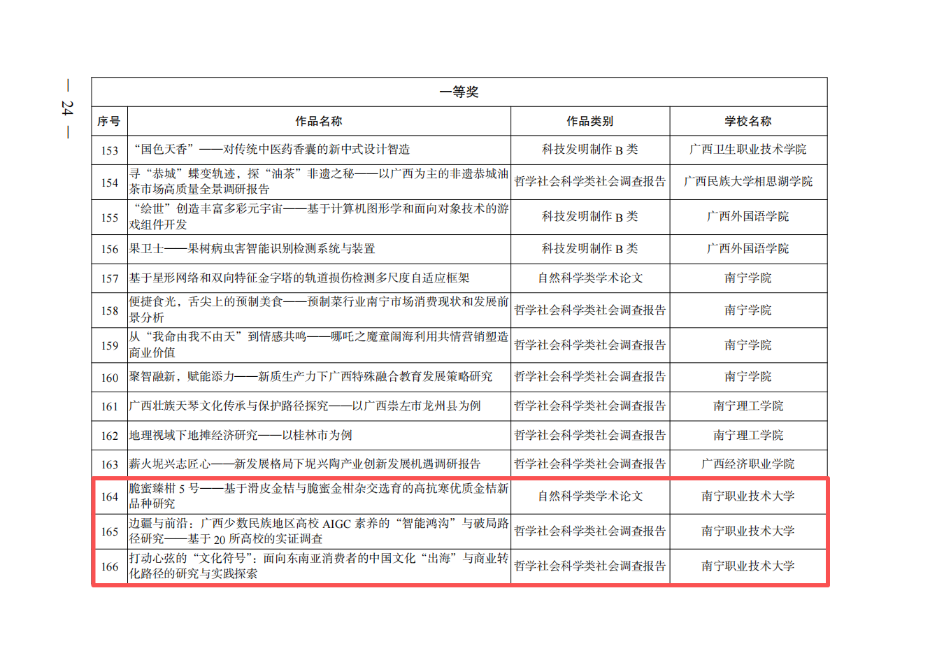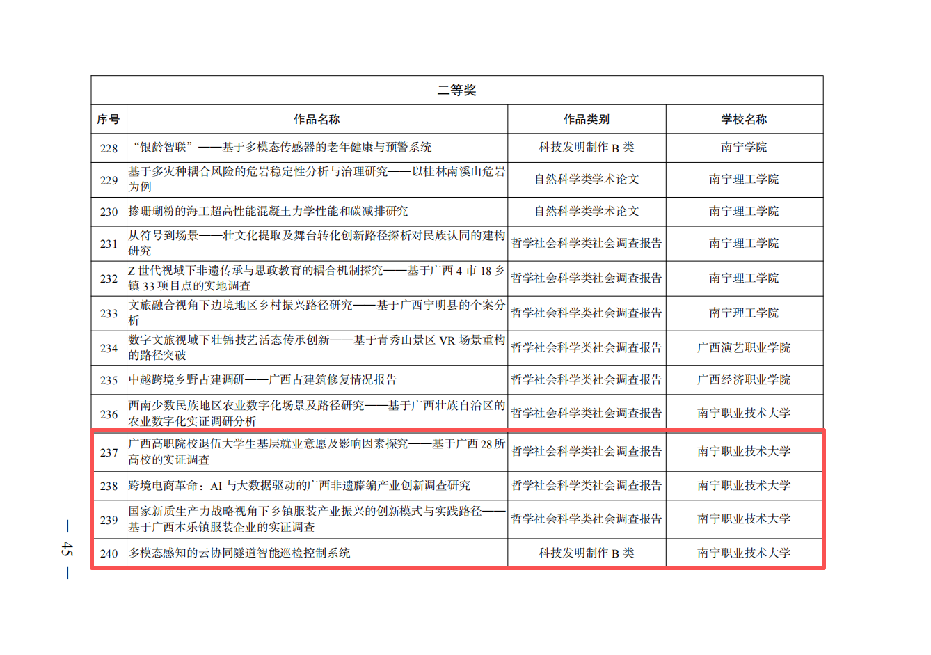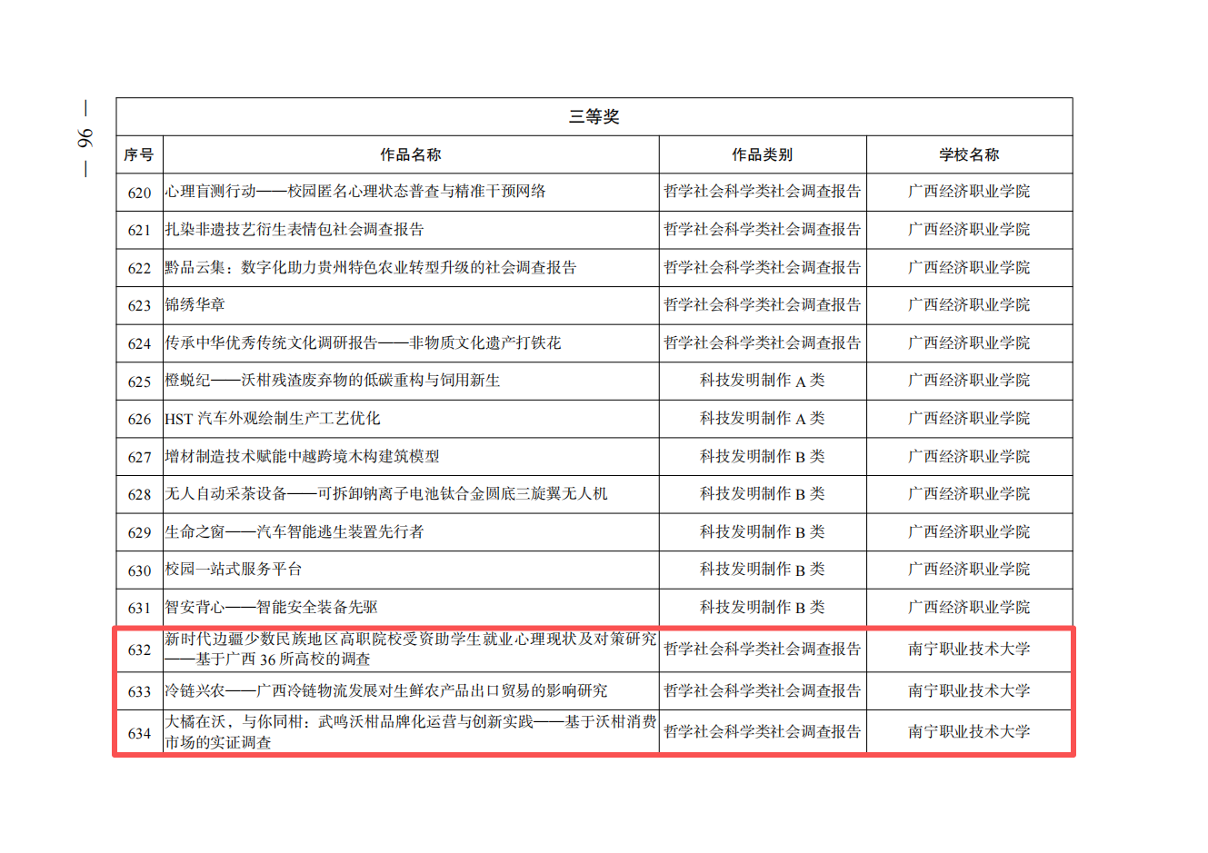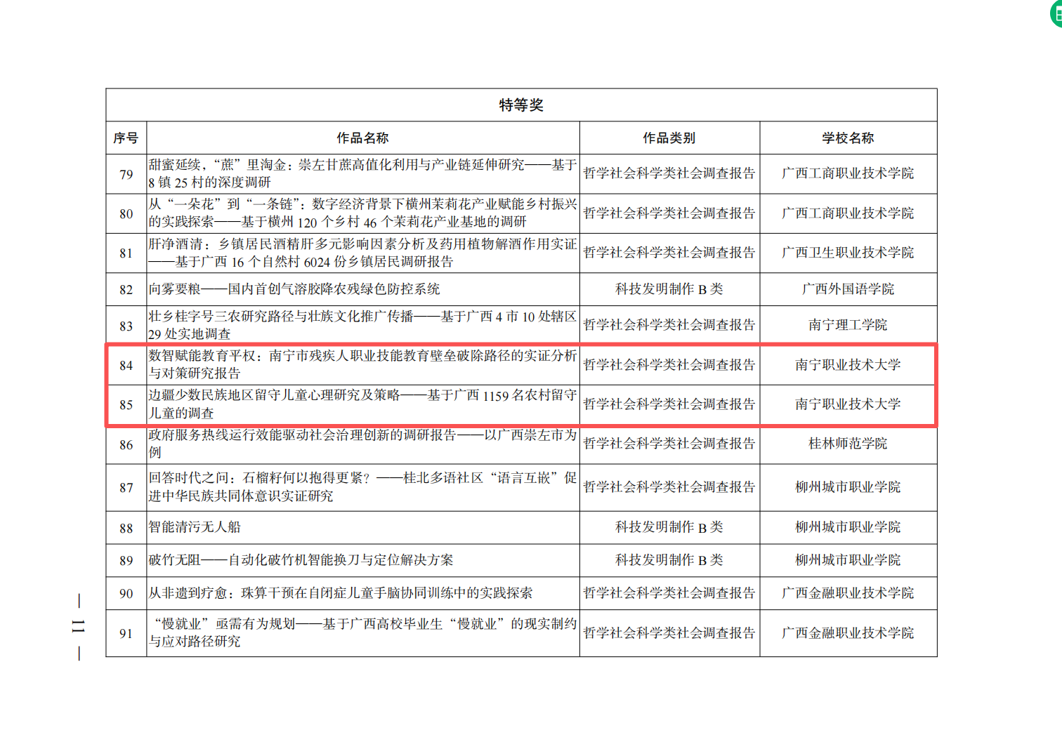 自赛事启动以来,我校高度重视,认真组织开展竞赛筹备工作,通过创新创业讲座、项目打磨会等形式,开展高质量、有针对性的创新创业培训,帮助参赛学生提高创新创业技能、完善参赛项目材料。最终,我校共遴选推荐27项优秀作品参加第十二届“挑战杯”广西大学生课外学术作品科技竞赛复赛评审,其中“数智赋能教育平权:南宁市残疾人职业技能教育壁垒破除路径的实证分析与对策研究报告”等10项优秀作品入围区赛终审决赛。