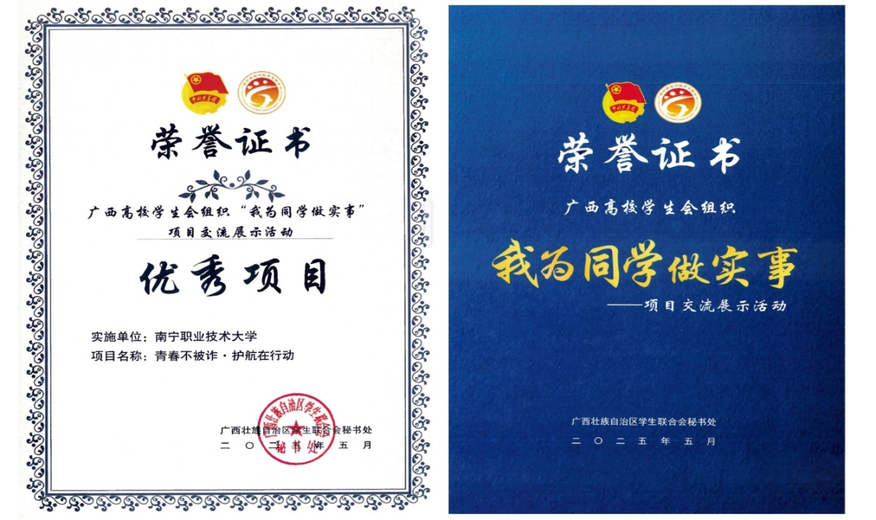 近日,广西壮族自治区学生联合会秘书处来信表扬,我校选送的“青春南职,律动逐梦”系列主题活动项目、“青春不被诈·护航在行动”项目表现出色、成效显著,在广西高校学生会组织“我为同学做实事”项目交流展示活动中获评“优秀项目”称号。