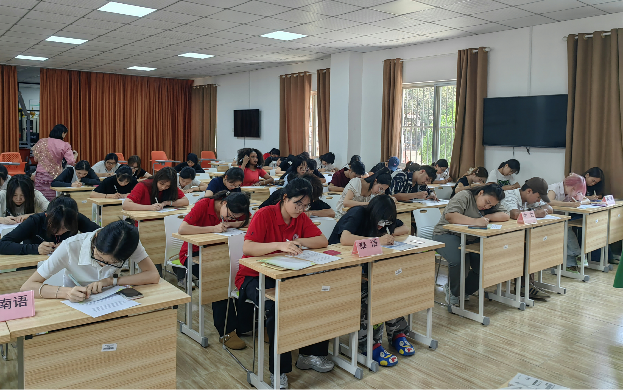 与此同时,一场别开生面的多语种书法比赛同步举行,将现场的文化交流推向高潮。参赛者们以中文、英文、泰语、越南语等不同语言挥毫泼墨,相同的笔墨纸砚勾勒出形态各异的文字之美。这一独特赛事不仅考验了学生的语言书写能力,更生动体现了“和而不同、美美与共”的文明对话理念,成为本次活动最具特色的记忆点之一。