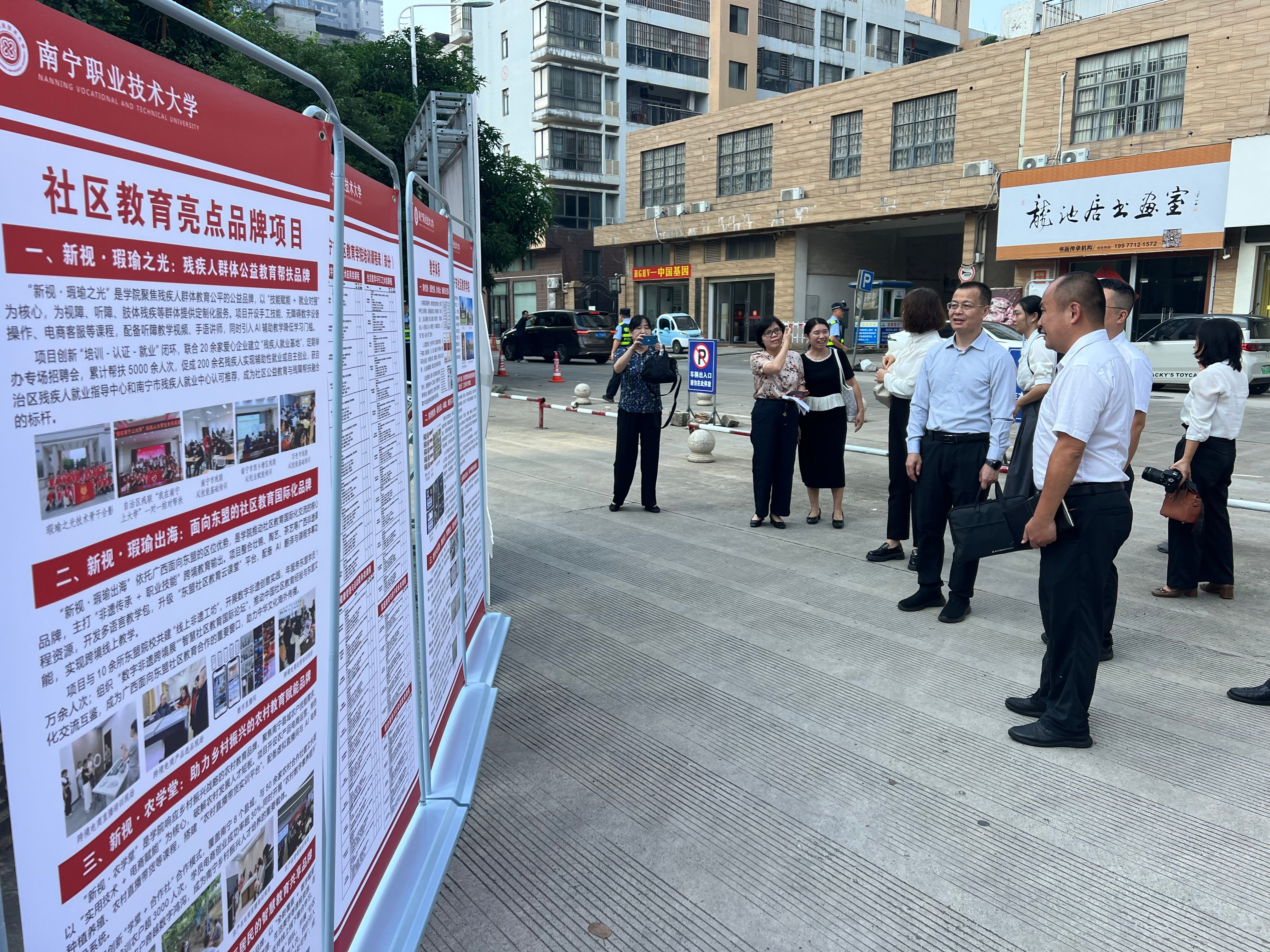 南宁市教育局副局长宁敏升(右二)及南宁市、横州市各城区教育局相关同志观看我校社区教育成果展示(陆健/摄)