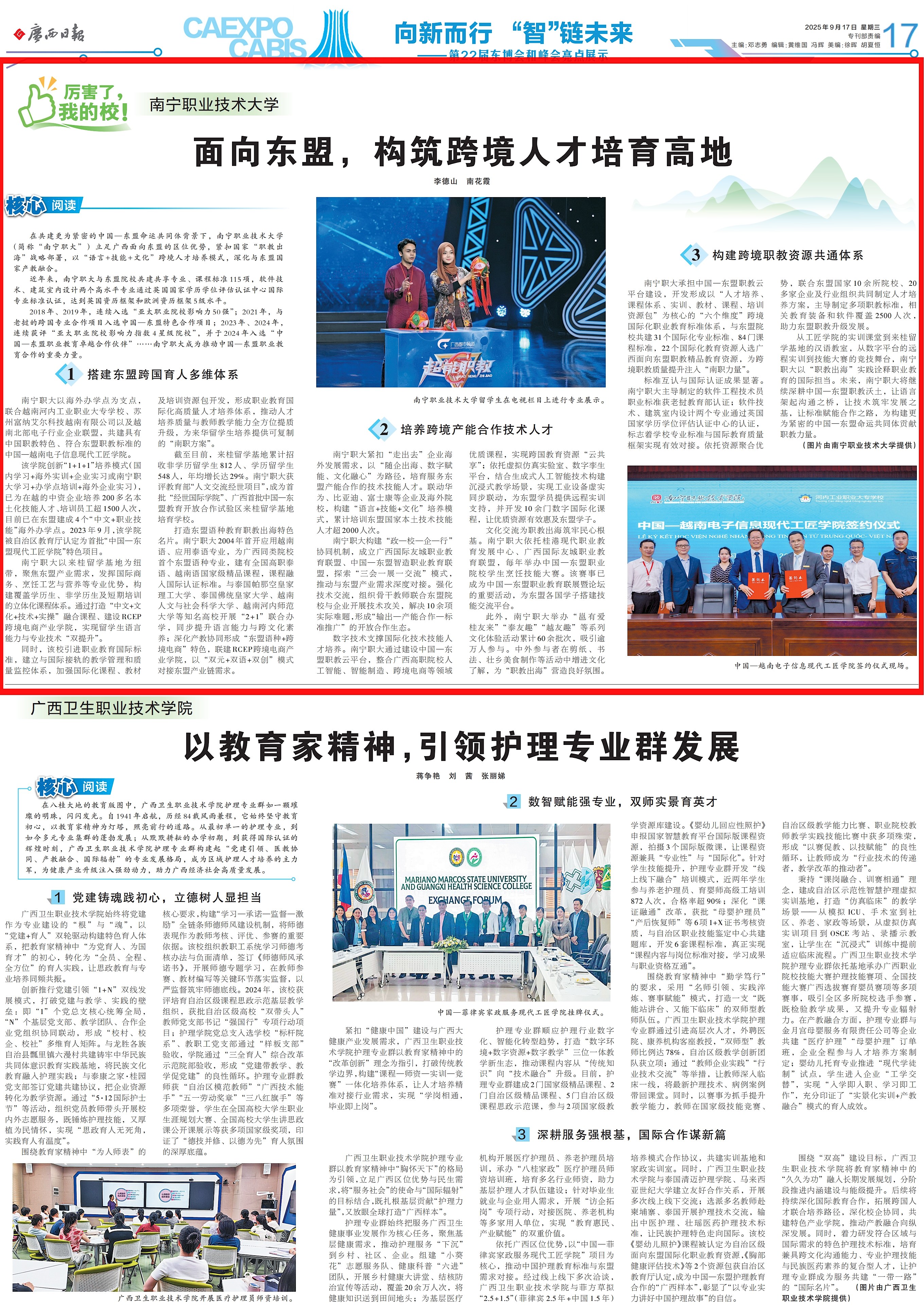 2018年、2019年,连续入选“亚太职业院校影响力50强”;2021年,与老挝的跨国专业合作项目入选中国—东盟特色合作项目;2023年、2024年,连续获评“亚太职业院校影响力指数4星级院校”,并于2024年入选“中国—东盟职业教育卓越合作伙伴”……南宁职大成为推动中国—东盟职业教育合作的重要力量。
