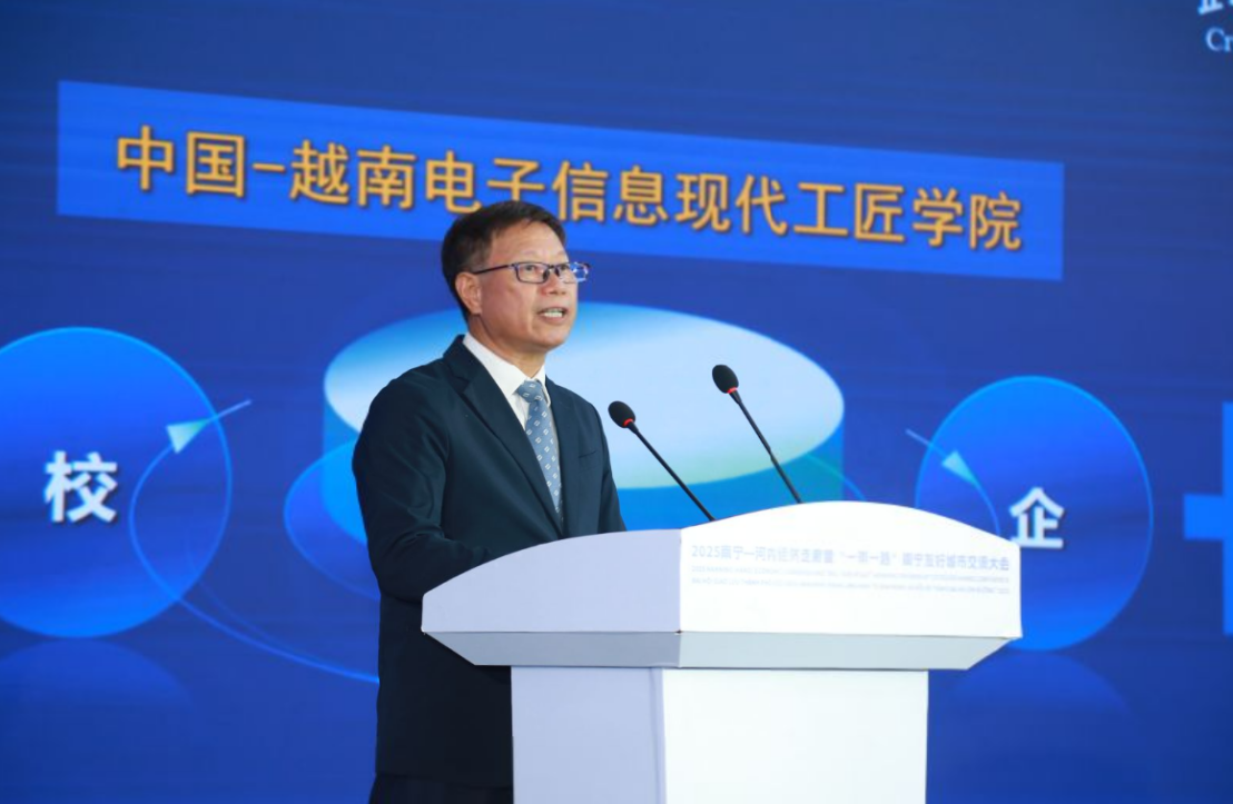 近日,2025南宁—河内经济走廊暨“一带一路”南宁友好城市交流大会在南宁举行。会上,我校分别与越南河内学院、立讯集团签订合作协议。学校党委副书记、校长周旺出席大会,并分享了与东盟国家合作办学经验。