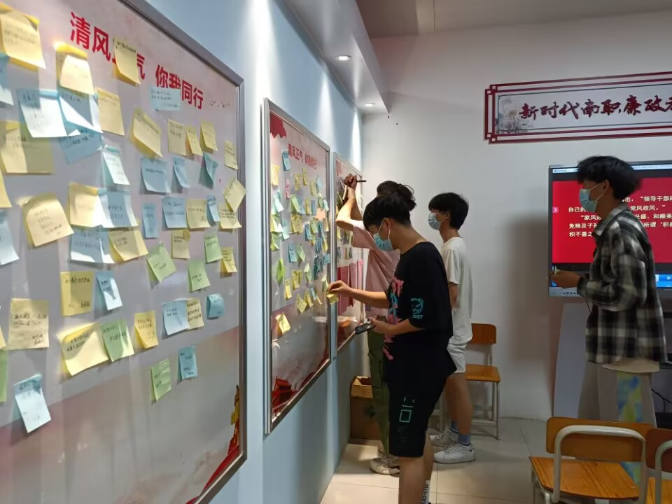 坚持“身边人”示范引领,抓好廉洁文化宣传。将廉洁文化贯穿于立德树人各环节、校园文化各内容,充分利用各类媒体和形式,广泛开展廉洁文化宣传,营造崇廉尚廉的浓厚氛围。持续丰富“清廉+校园文化”,将廉洁元素纳入校园文化活动,开展丰富多彩的清廉校园系列文化活动。举办“清廉南职”主题展、典型案例警示教育展,开展剪纸廉洁主题活动等。学生制作的《明知不可为而为之》视频作品入选2023年度全区高校廉洁教育系列活动“润心话语”视频征集获奖作品三等奖。