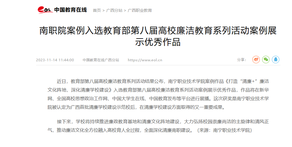 近日,教育部第八届高校廉洁教育系列活动结果公布,南宁职业技术学院案例作品《打造“清廉+”廉洁文化阵地,深化清廉学校建设》入选教育部第八届高校廉洁教育系列活动案例展示优秀作品,作品将在新华网、全国高校思想政治工作网、中国大学生在线、中国教育发布等平台进行展播。这次获奖是南宁职业技术学院被认定为广西首批清廉学校建设示范校后,在清廉学校建设方面取得的又一重要成果。