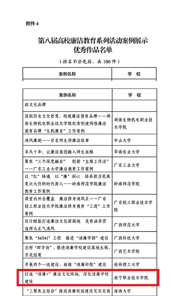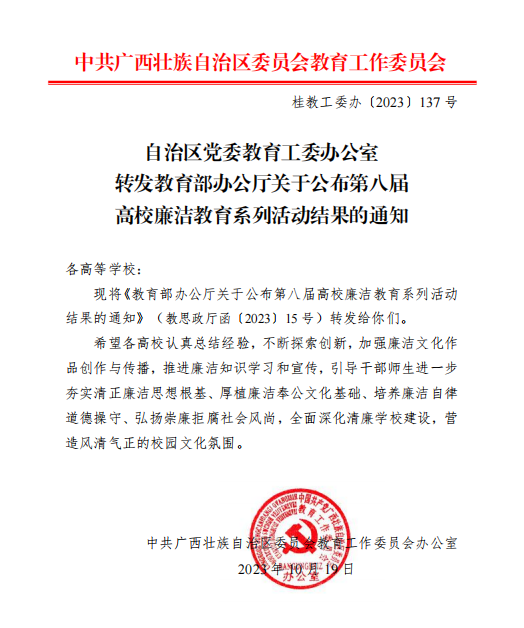 近日,教育部第八届高校廉洁教育系列活动结果公布,我校案例作品《打造“清廉+”廉洁文化阵地,深化清廉学校建设》入选教育部第八届高校廉洁教育系列活动案例展示优秀作品,作品将在新华网、全国高校思想政治工作网、中国大学生在线、中国教育发布等平台进行展播。这次获奖是我校被认定为广西首批清廉学校建设示范校后,在清廉学校建设方面取得的又一重要成果。