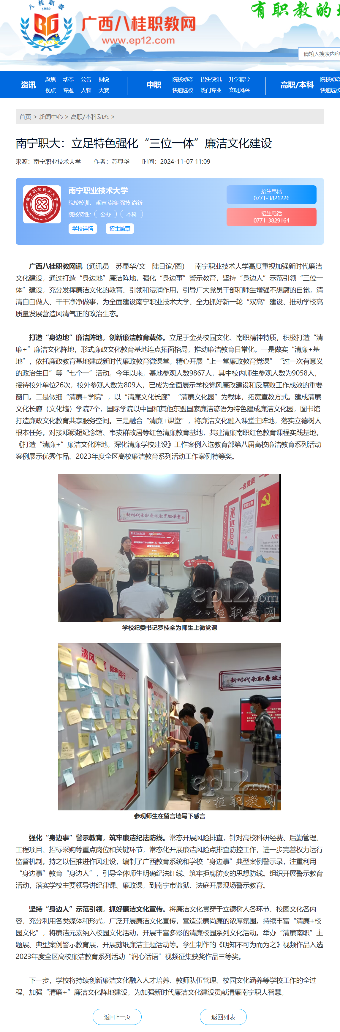 上一条: 【广西云-广西日报】南宁职业技术大学:立足特色强化“三位一体”廉洁文化建设