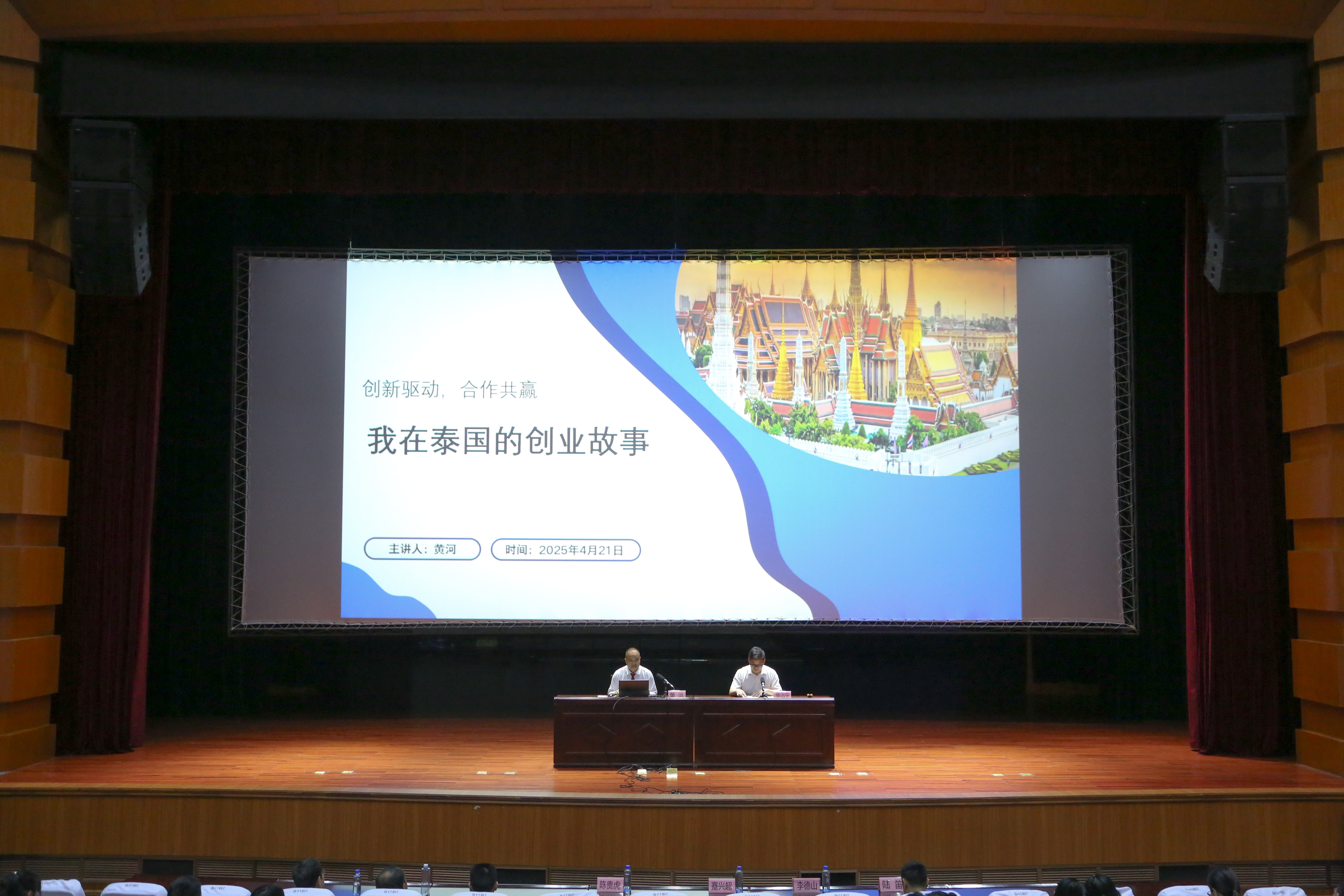 4月21日,由我校国际学院主办主题为“创新驱动,合作共赢——我在泰国的创业故事”的讲座在学校会议中心大礼堂举行。学校党委书记蹇兴超出席活动。本次讲座邀请我校2004级应用泰语专业杰出校友、泰国广西总会副主席黄河,为学校师生带来了一场别开生面的创业分享与经验交流。
