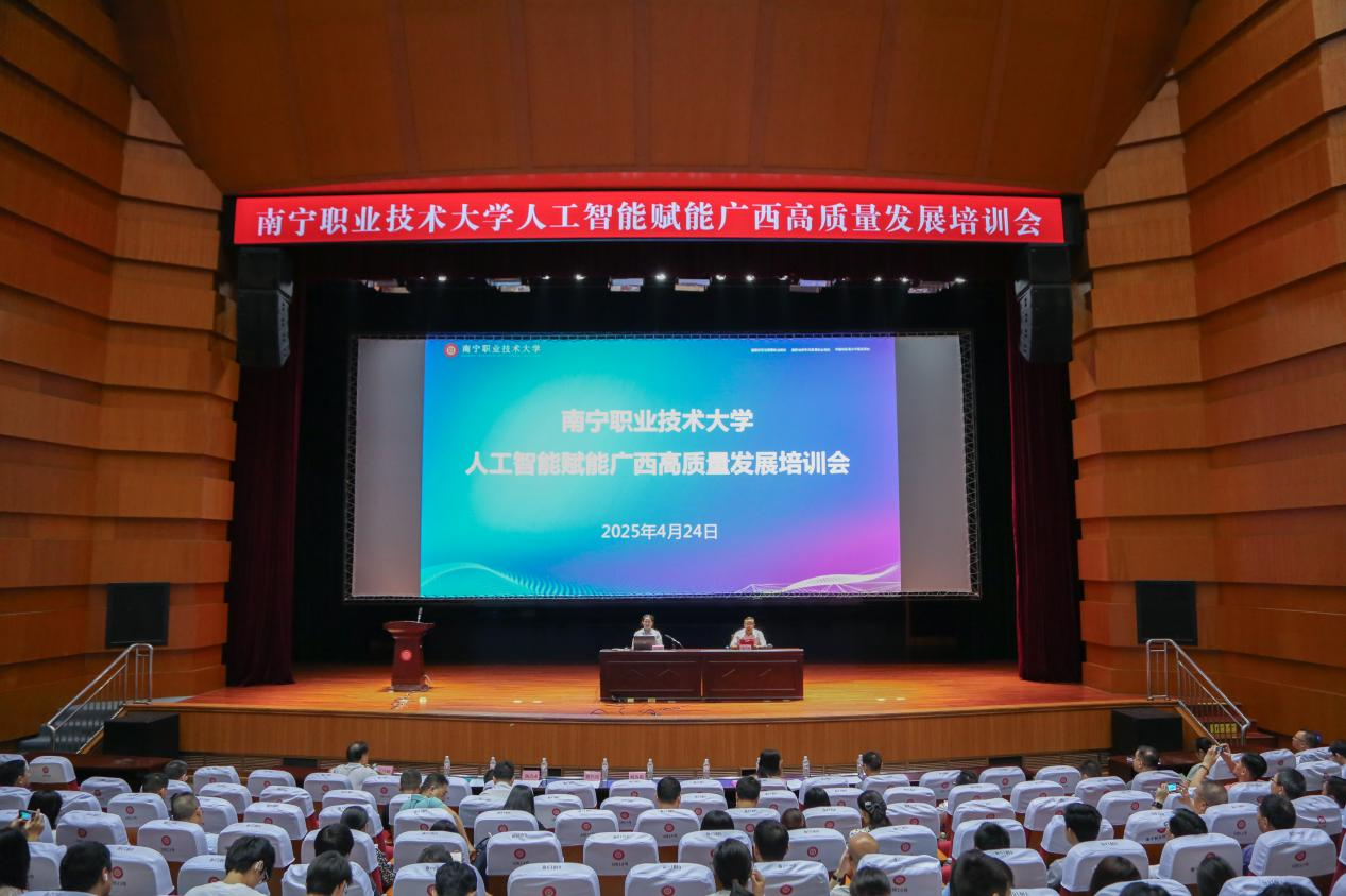 4月24日,我校在学校大礼堂举办人工智能赋能广西高质量发展培训会,特邀自治区大数据发展局场景和系统建设推进处处长何弄影担任主讲嘉宾。学校党委书记蹇兴超出席并主持会议。