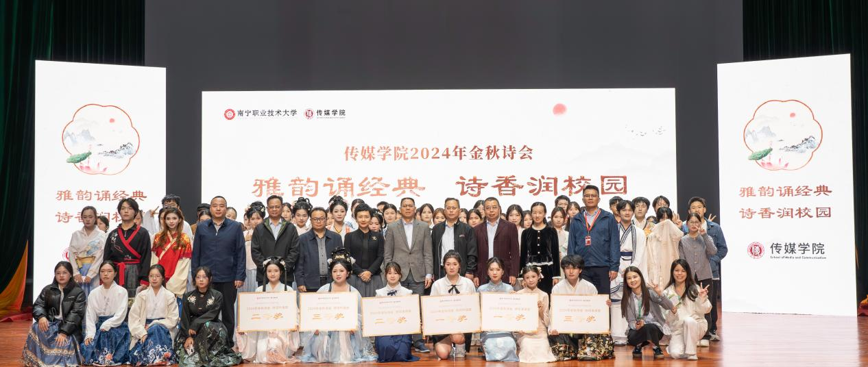 本届诗会邀请广西知名作家、诗人、电视主持人以及学校党委宣传部、校团委领导、专家担纲评委。经过激烈角逐,网络新闻与传播专业的《诗词里的中国·李白》 、新闻采编与制作专业的《秀甲天下 壮美八桂》两个节目获评诗会一等奖;传播与策划专业的《诗经·秦风·蒹葭》《百里柳江话柳公》两个节目获二等奖;现代文秘专业的《春江花月夜》,网络新闻与传播专业《诗话山水,于情桂林》获三等奖。