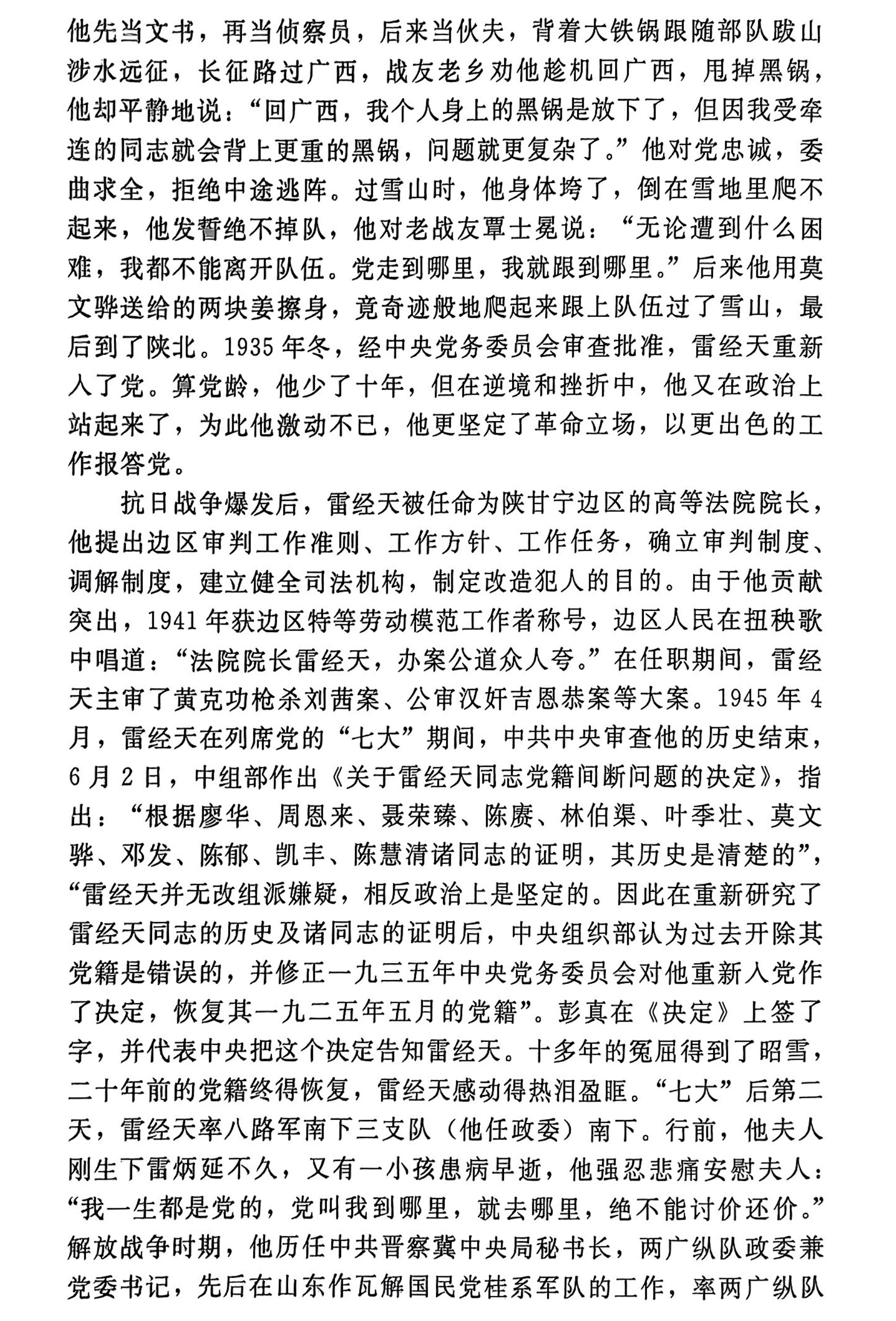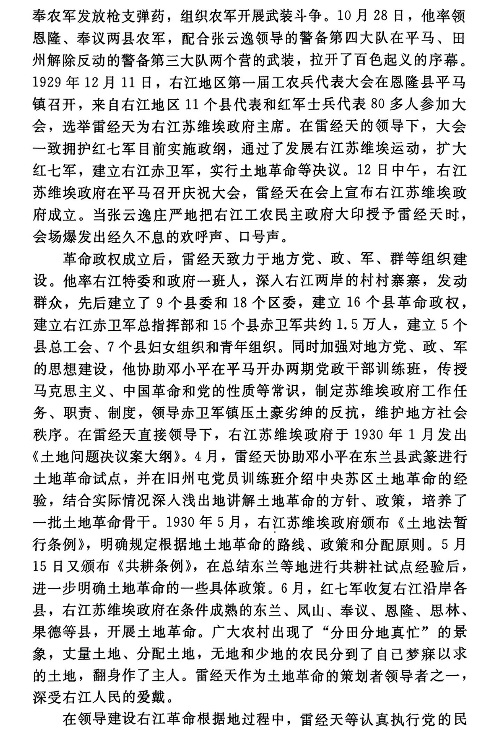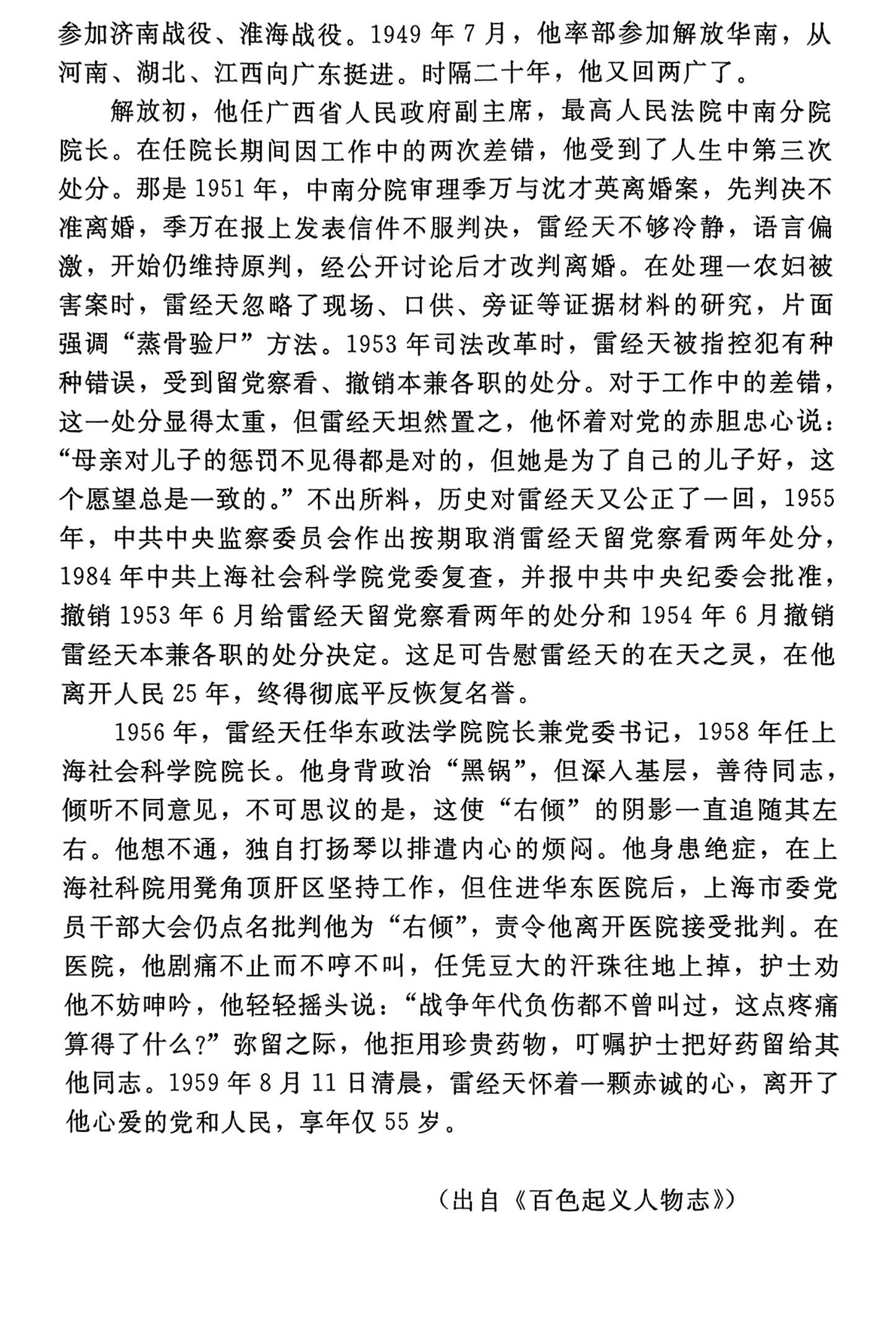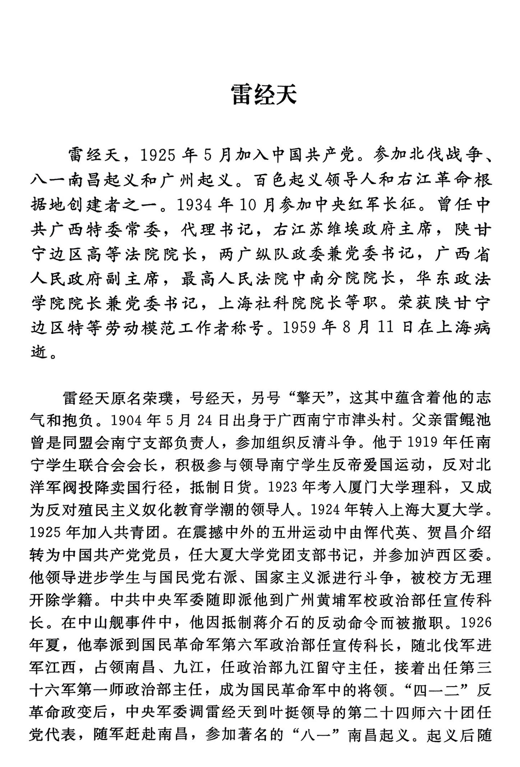 雷经天,1904年出生,15岁被选为南宁学生联合会会长。参加北伐战争、八一南昌起义和广州起义。是百色起义领导人和右江革命根据地创建者之一。曾任中共广西特委常委,代理书记,右江苏维埃政府主席,陕甘宁边区高等法院院长,两广纵队政委兼党委书记,广西省人民政府副主席,最高人民法院中南分院院长,华东政法学院院长兼党委书记,上海社科院院长等职。荣获陕甘宁边区特等劳动模范工作者称号。