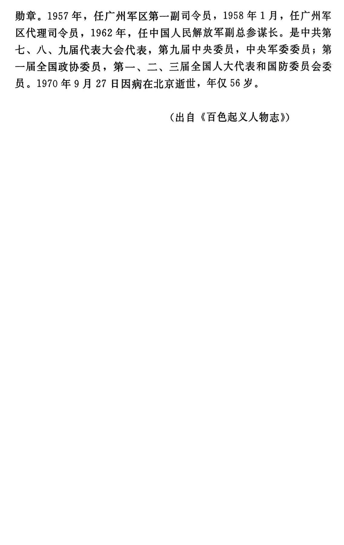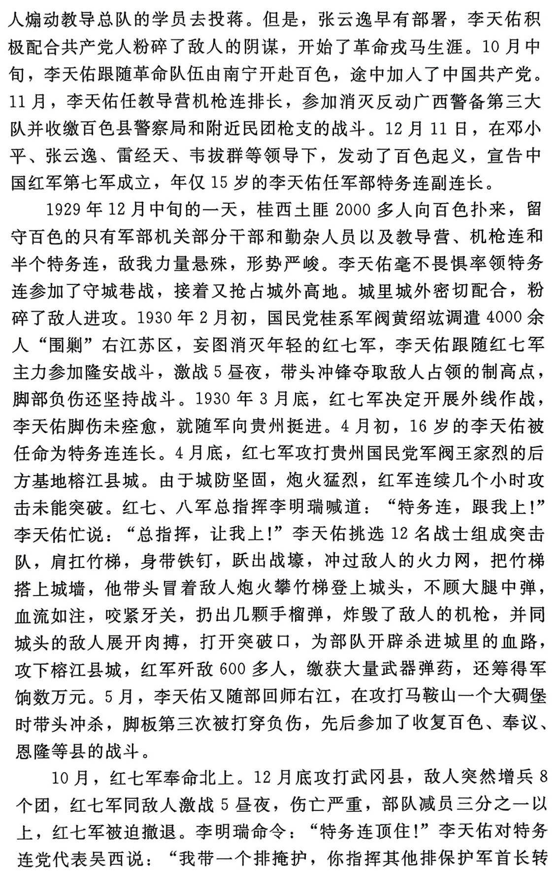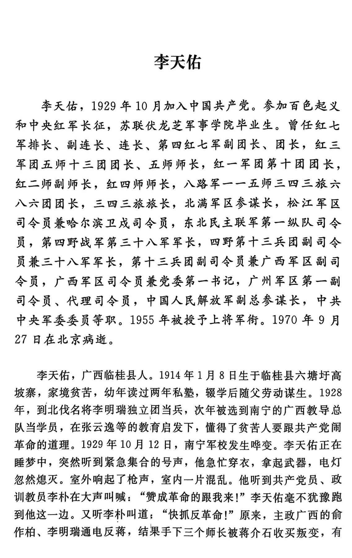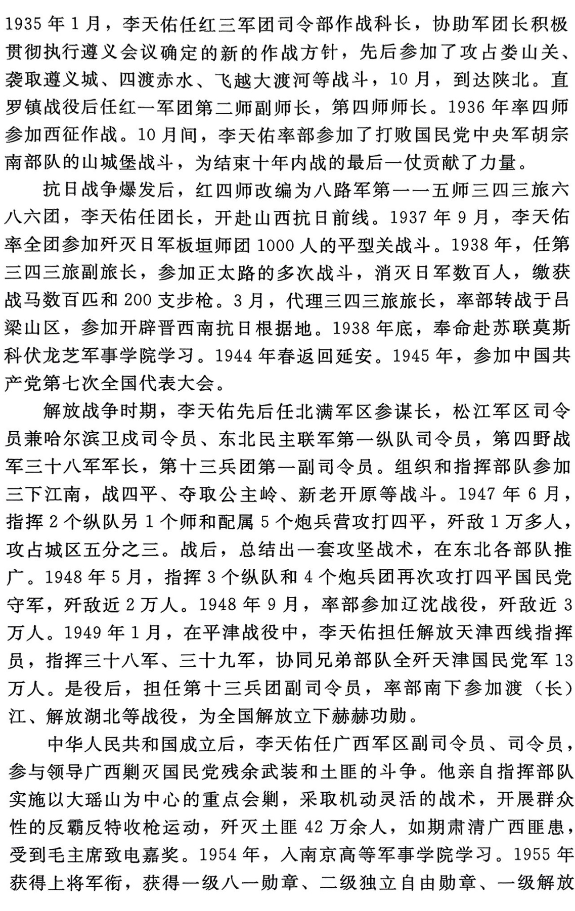 李天佑,广西临桂人,参加百色起义和中央红军长征。曾任红七军排长、副连长、连长、第四红七军副团长、团长,红三军团五师十三团团长、五师师长,红一军团第十团团长,红二师副师长,红四师师长,八路军一一五师三四三旅六八六团团长,三四三旅旅长,北满军区参谋长,松江军区司令员兼哈尔滨卫戍司令员,东北民主联军第一纵队司令员,第四野战军第三十八军军长,四野第十三兵团副司令员兼三十八军军长,第十三兵团副司令员兼广西军区副司令员,广西军区司令员兼党委第一书记,广州军区第一副司令员、代理司令员,中国人民解放军副总参谋长,中共中央军委委员等职。1949年底,就任第十三兵团副司令员兼广西军区副司令员期间,参与广西剿匪工作,制定有效策略,成功肃清广西匪患。1955年被授予上将军衔。