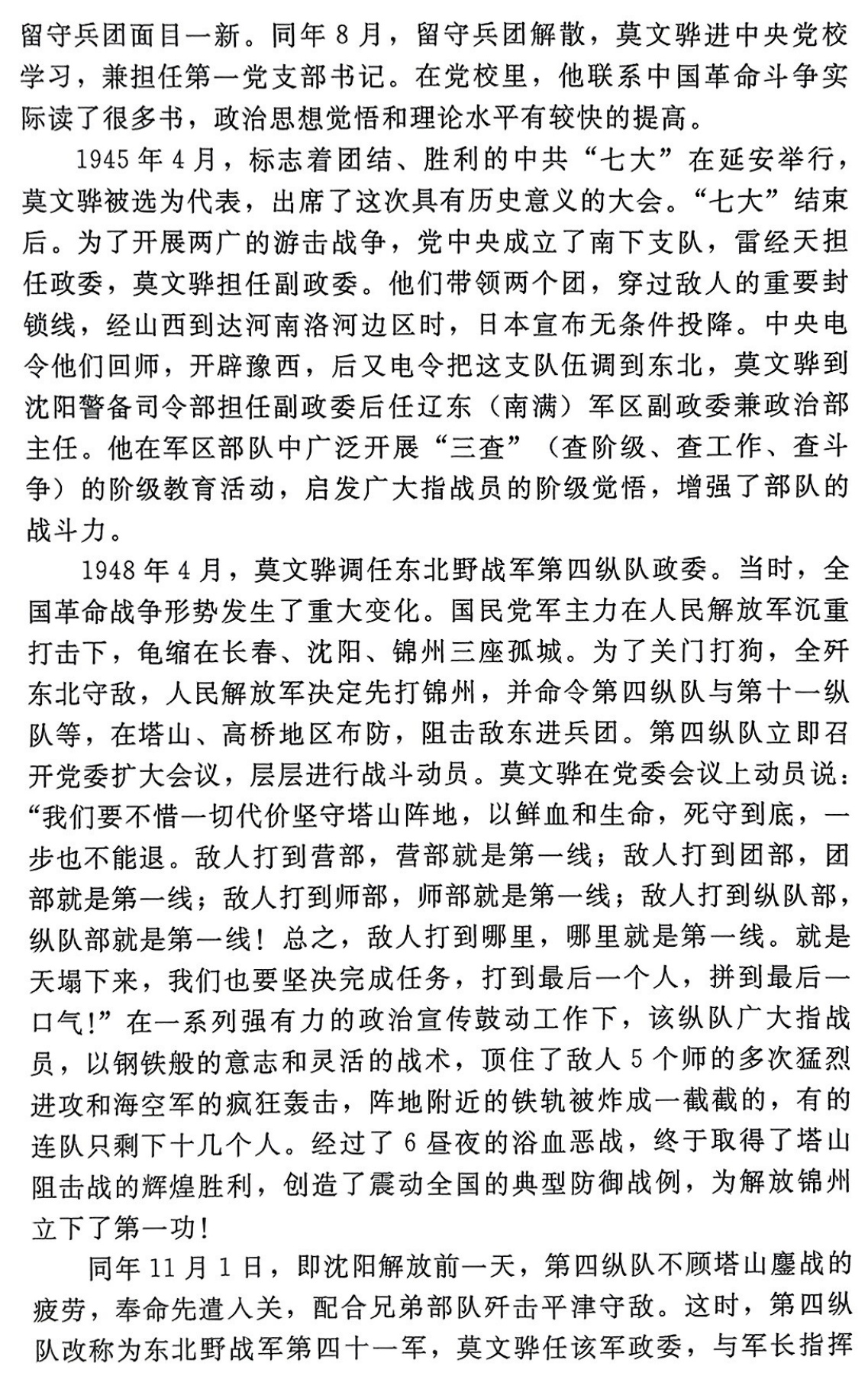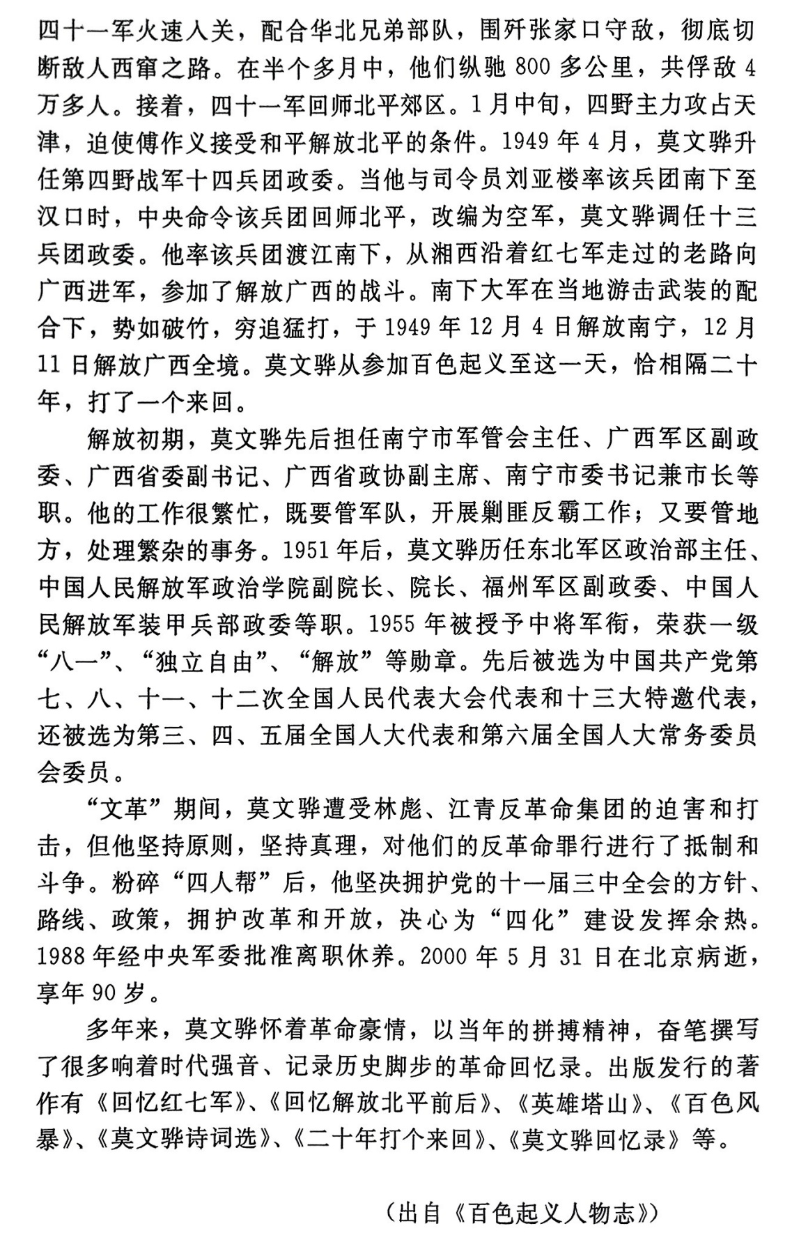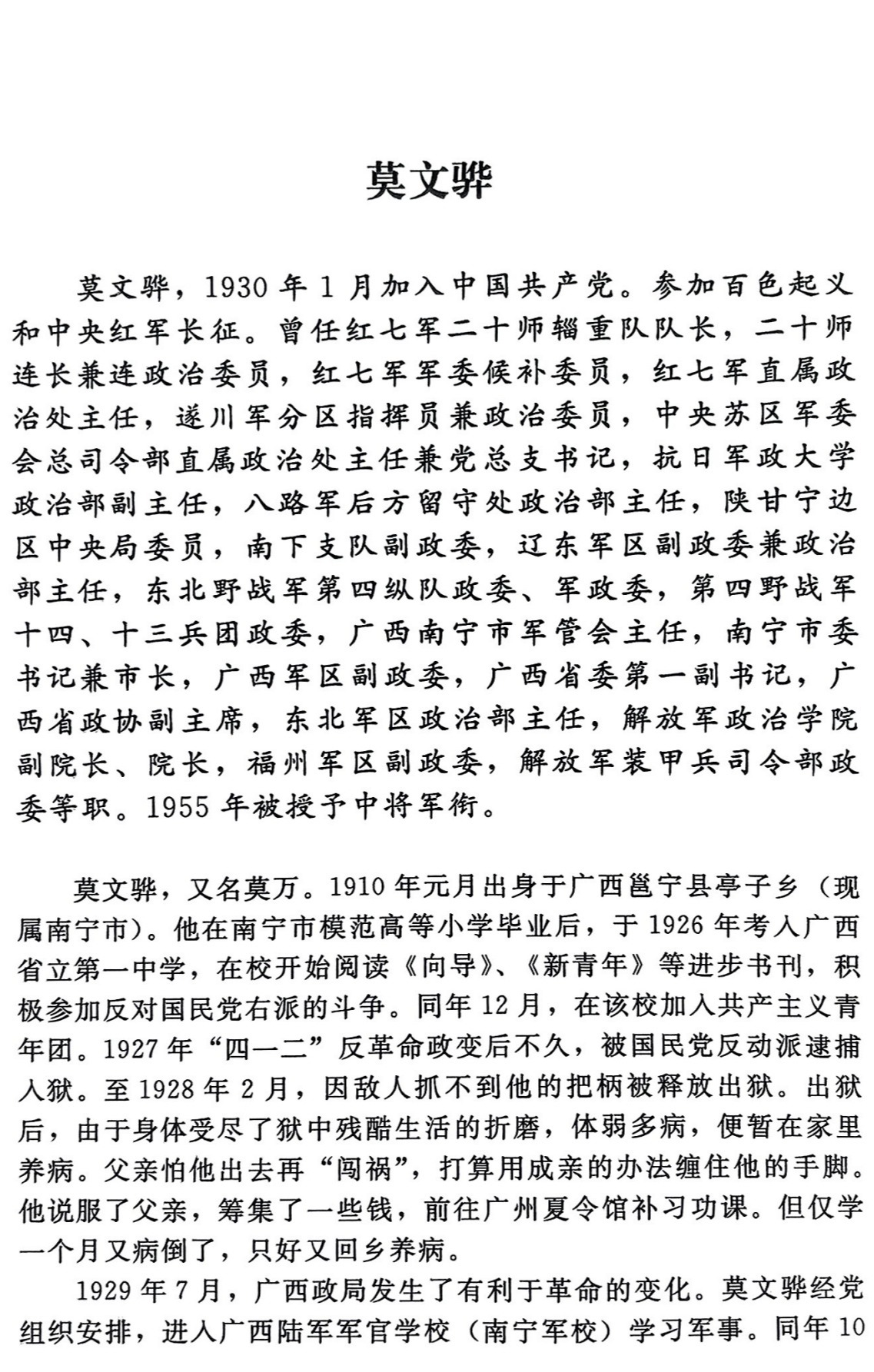 莫文骅,广西南宁人,参加百色起义和中央红军长征。曾任红七军直属政治处主任,遂川军分区指挥员兼政治委员,中央苏区军委会总司令部直属政治处主任兼党总支书记,抗日军政大学政治部副主任,八路军后方留守处政治部主任,陕甘宁边区中央局委员,南下支队副政委,辽东军区副政委兼政治部主任,东北野战军第四纵队政委、军政委,第四野战军十四、十三兵团政委,广西南宁市军管会主任,南宁市委书记兼市长,广西军区副政委,广西省委第一副书记,广西省政协副主席,东北军区政治部主任,解放军政治学院副院长、院长,福州军区副政委,解放军装甲兵司令部政委等职。1955年被授予中将军衔。