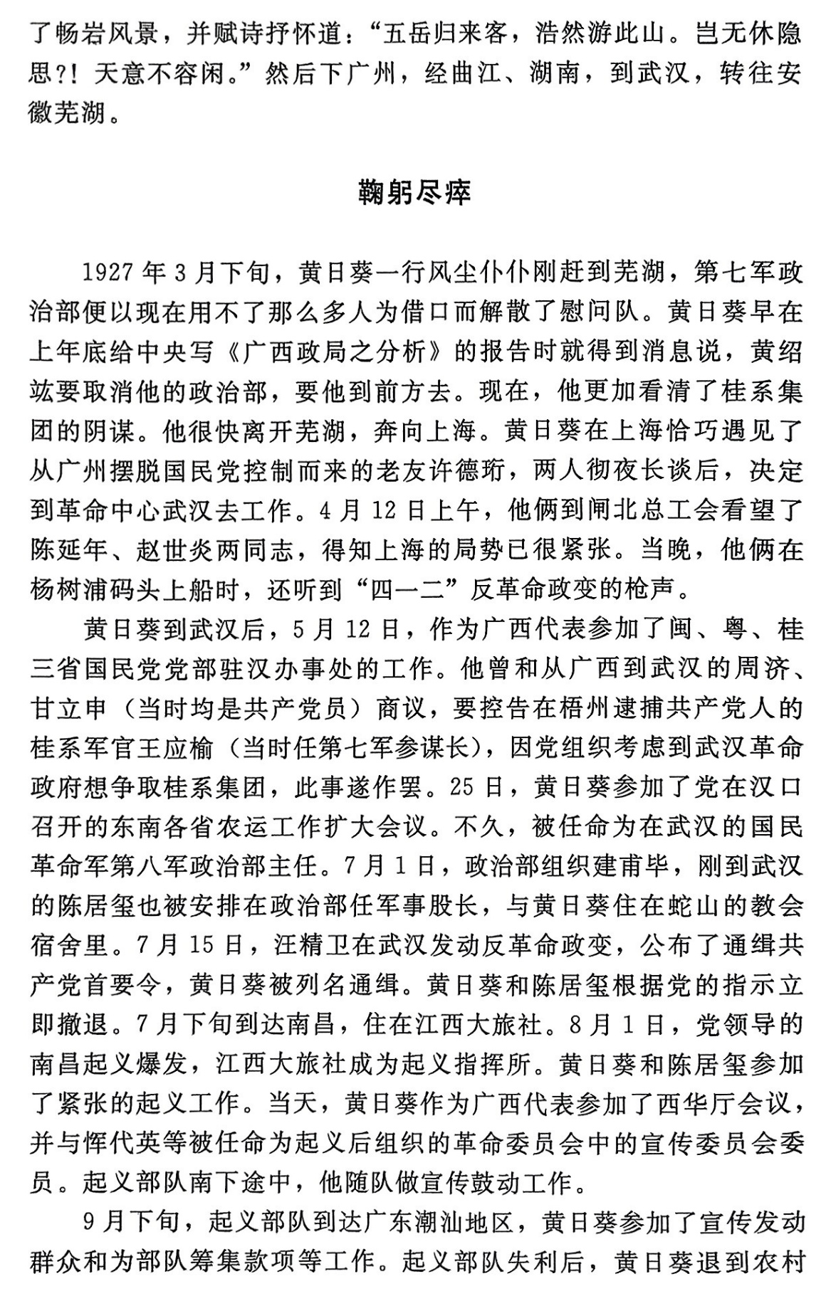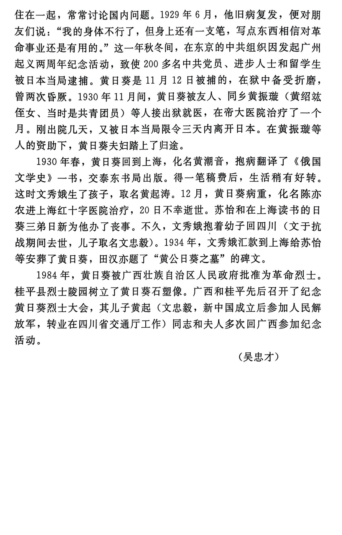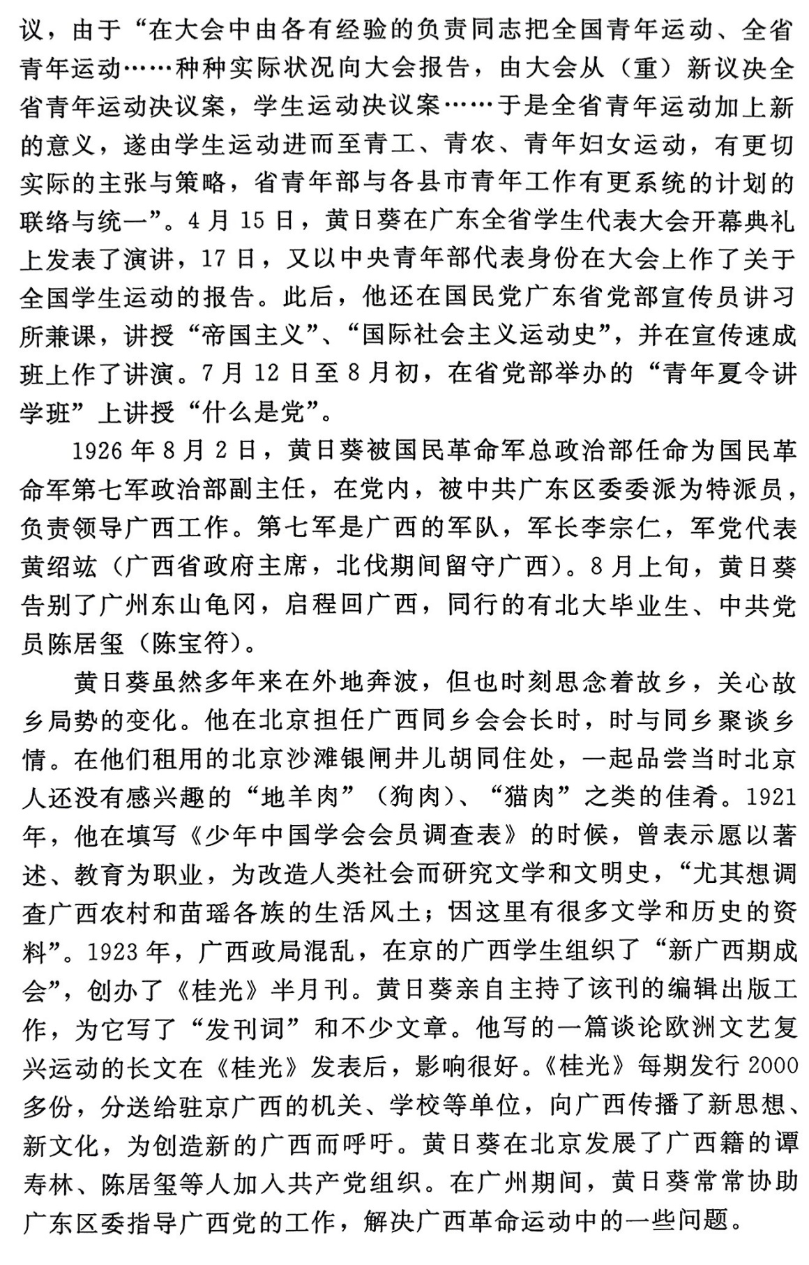 黄日葵,广西桂平人。1921年上半年加入中国共产党。北京大学毕业生,“五四”运动的闯将和组织者之一,广西最早的共产党员。曾任北京大学马克思学说研究会会员、少年中国学会会员,共青团北京地委秘书,共青团北京地委宣传委员,驻北京广西同乡会会长,共青团广东区委学生运动委员会书记,国民党中央党部青年部秘书,童子军委员会委员兼政治训练处主任,国民革命军第七军政治部副主任,中共广东区委特派员,中共南宁地委书记,国民革命军第八军政治部主任,南昌起义部队宣传委员会委员等职。1930年12月,病逝于上海,时年32岁。