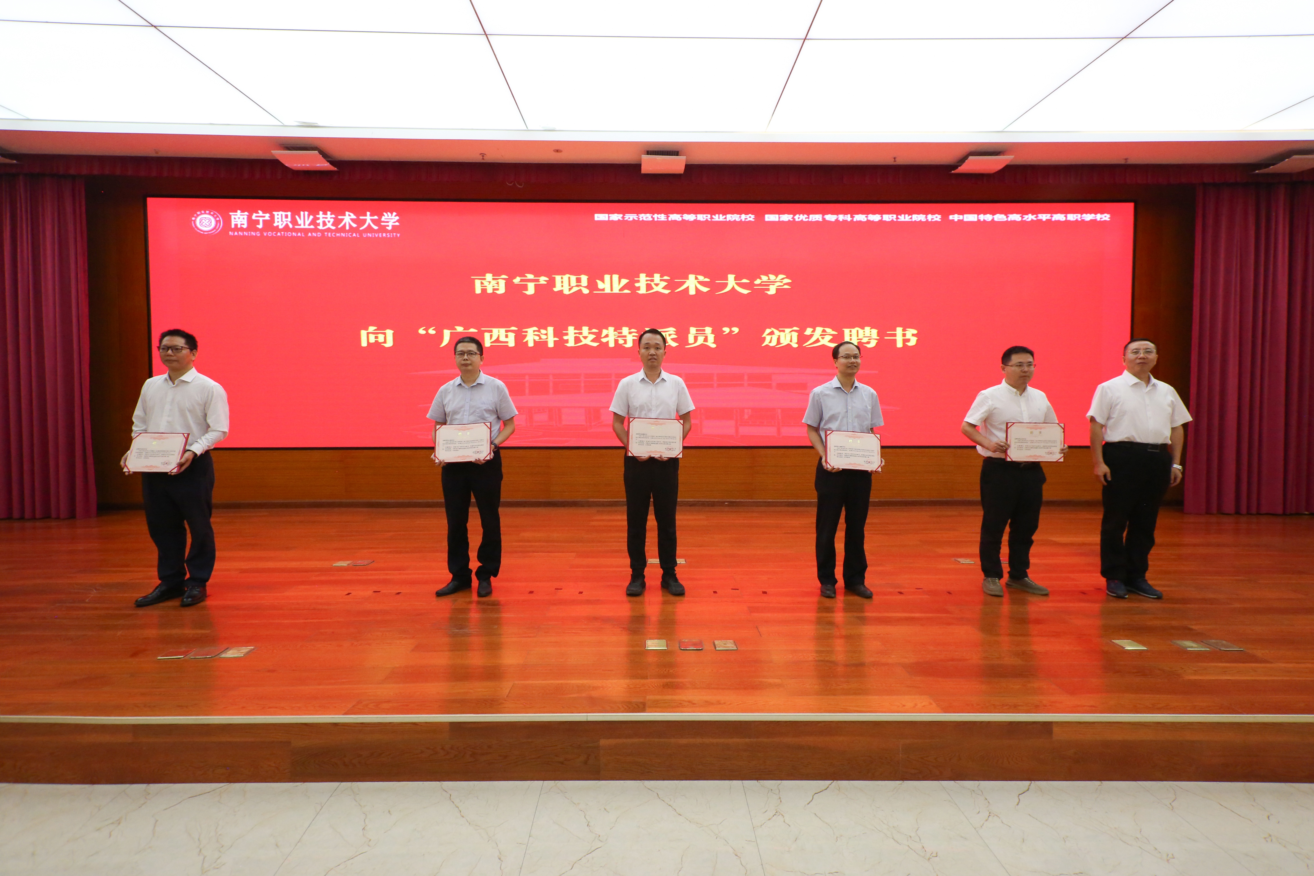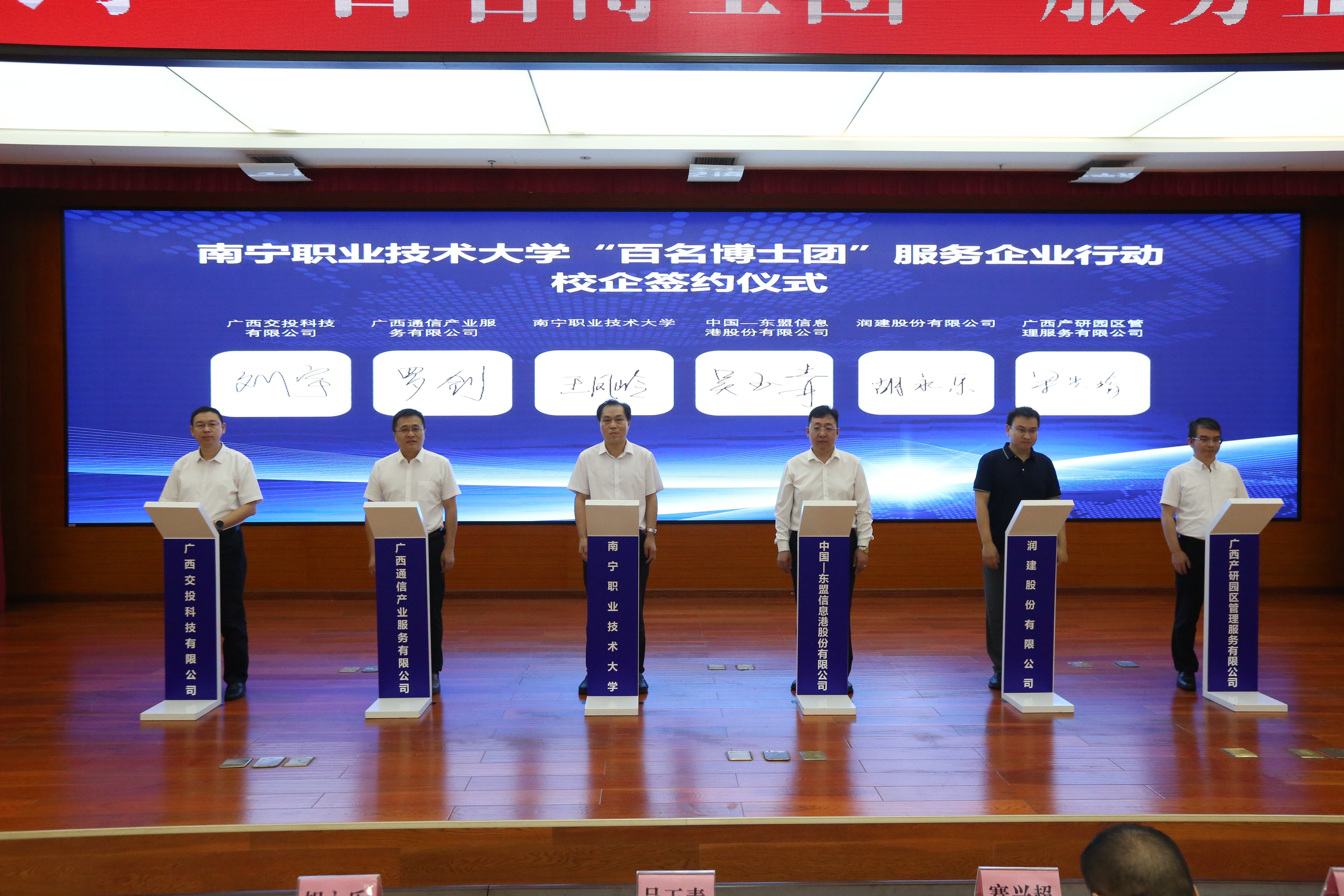 会上,我校与中国—东盟信息港股份有限公司、广西通信产业服务有限公司、润建股份有限公司、广西交投科技有限公司、广西产研园区管理服务有限公司等5家行业龙头企业签订了战略合作协议,并向广西科技厅选拔的我校5名广西科技特派员颁发了聘书。