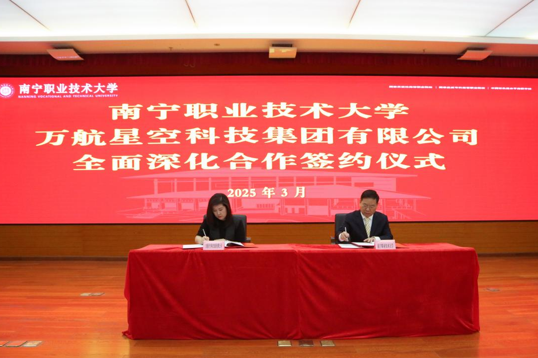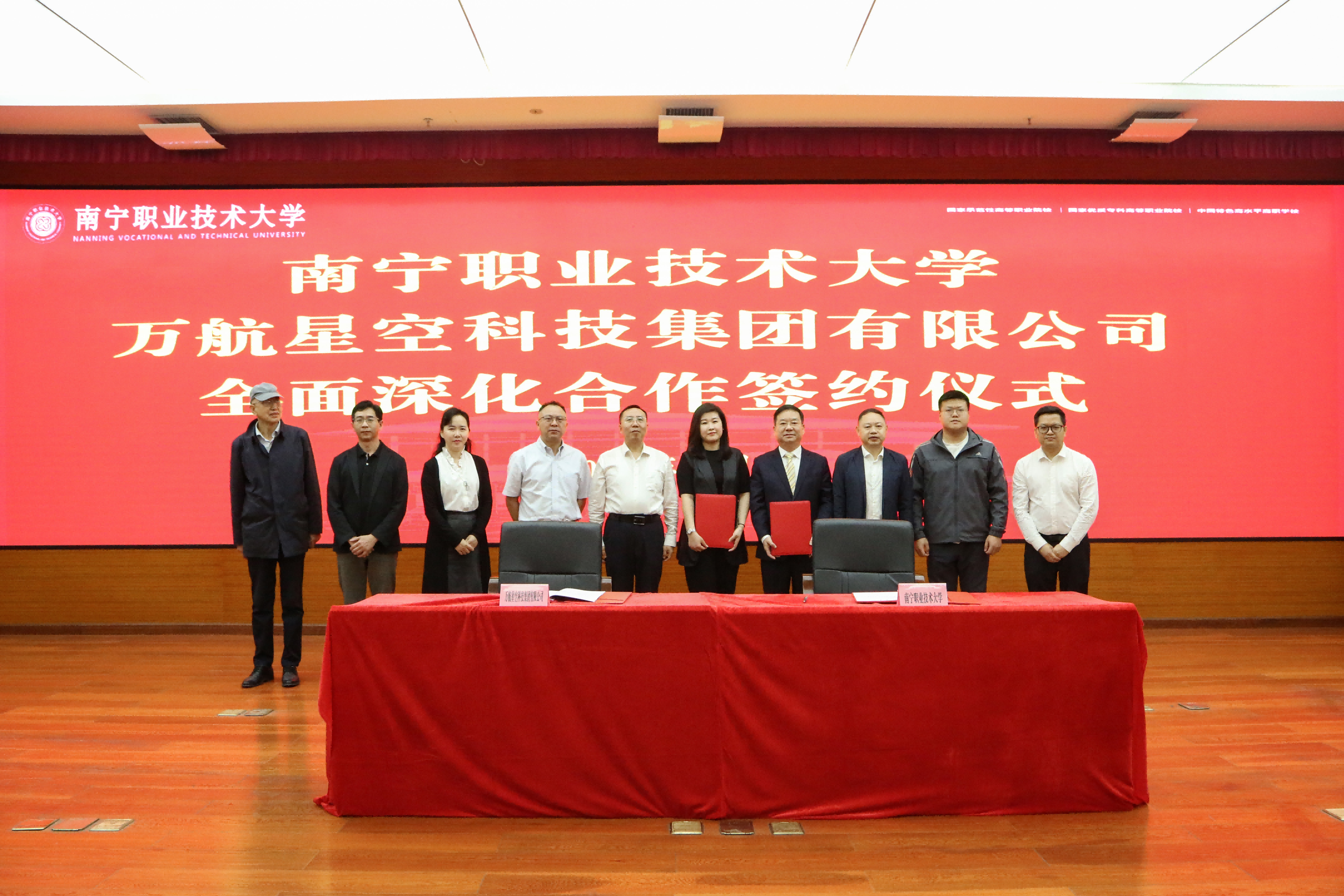在与会人员的共同见证下,双方签订合作协议,标志着我校与万航星空科技集团有限公司将建立长期稳定的合作关系。此次签约是学校产教融合的重要成果。未来,双方将在专业人才培养、实践基地建设、科技创新、技能培训、科技成果转化和社会服务等方面全方位合作,为南宁市培育低空经济优秀人才,助力南宁市“一体两翼”产业发展格局建设,推动南宁市低空经济发展迈向新高度。