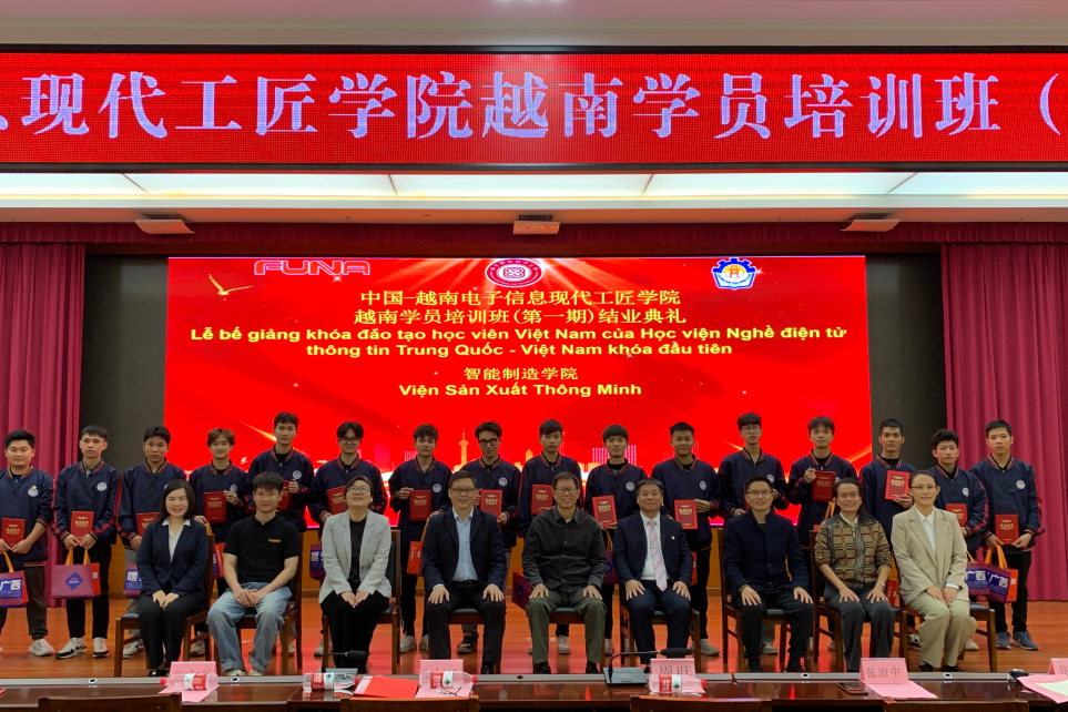 12月2日,中国-越南电子信息现代工匠学院首期越南学员培训班圆满完成培训任务,在我校会议中心2号厅举行了简短而隆重的结业典礼。学校党委副书记、校长周旺,河内工业职业大专学校教师代表阮英秀,苏州富纳艾尔科技越南有限公司代表黄庭凯以及国际学院、智能制造学院负责人、专业教师团队及培训班16名学员参加典礼。典礼上,周旺为培训班16名学员一一颁发结业证书,并合影留念。河内工业职业大专学校教师代表阮英秀对培训班的成...