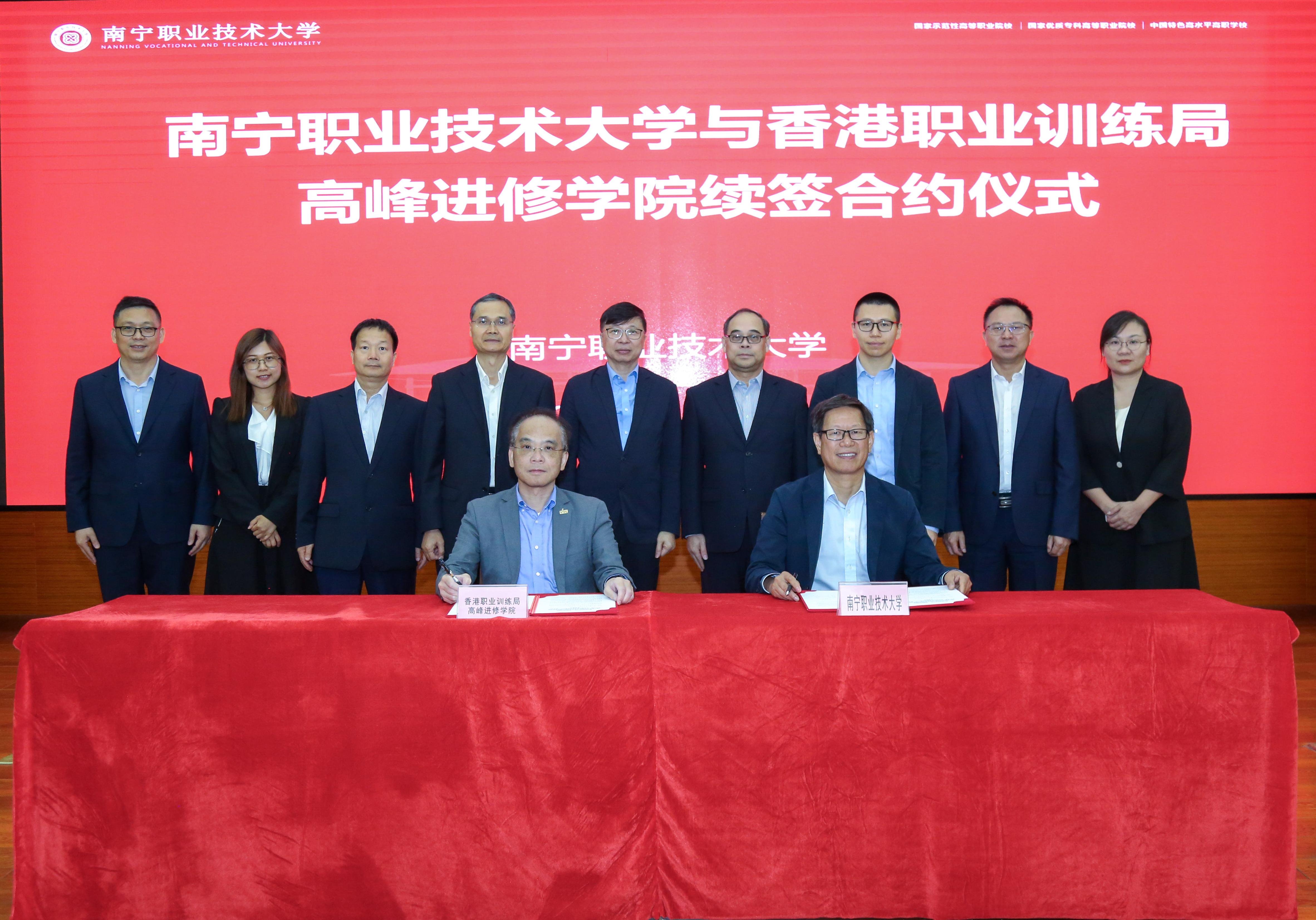 5月27日下午,南宁职业技术大学与香港职业训练局高峰进修学院续签合约仪式在南宁职大会议中心2号厅举行。香港职业训练局副执行干事廖世乐、高级助理执行干事兼高峰进修学院院长苏伟文,自治区教育厅二级巡视员、对外合作与交流处处长罗耀光,南宁职大党委副书记、校长周旺,南宁职大党委常委、副校长万玉文及相关部门负责人共同出席续签合约仪式。
