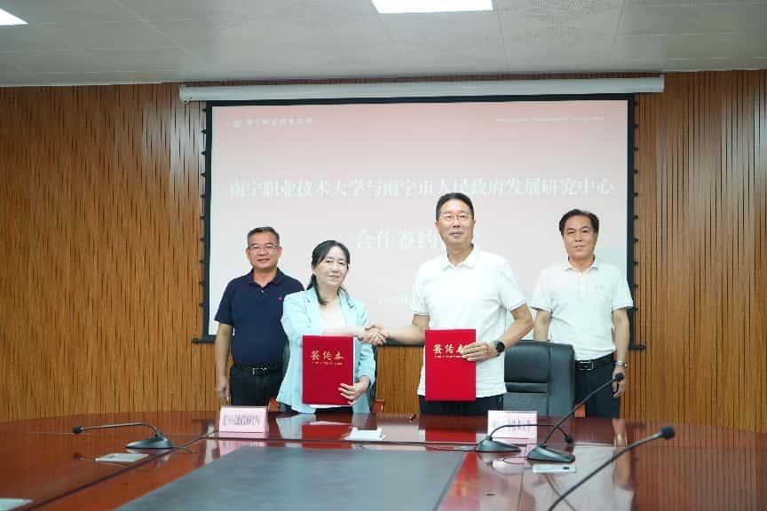 6月4日上午,南宁职业技术大学与南宁市人民政府发展研究中心(以下简称:研究中心)合作签约仪式在学校综合楼三楼第一会议室举行。研究中心党组书记、二级巡视员梁培正,副主任、三级调研员劳世青,科研管理与信息科科长、一级主任科员夏群珍与相关科室人员,以及南宁职大党委常委、副校长王凤岭,职业教育发展研究院院长易著梁,人工智能学院院长李光荣,职业教育发展研究院副院长韦国友等学校代表出席签约仪式,共同见证校政合作的重要时刻。