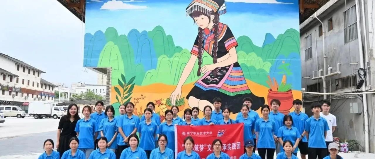 在南宁市江南区淡村壮药香料市场,一群身着蓝色院服的青年身影格外亮眼 —— 他们是南宁职业技术大学“建心筑梦”文化传承实践团的同学们。怀揣着对文化传承的热忱与对实践创新的追求,他们以墙为纸,画笔作媒,经过六天的辛勤绘制,完成了三幅总面积达120平米的墙绘作品,为这座承载着市井烟火与传统记忆的市场注入了青春活力与文化底蕴。