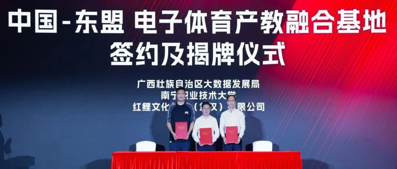 7月27日下午,由广西壮族自治区大数据发展局、南宁职业技术大学、红鲤文化传播(武汉)有限公司三方牵头成立的中国—东盟电子体育产教融合基地举行签约及揭牌仪式。 南宁市委常委、统战部部长、南宁市人民政府副市长韦江,广西壮族自治区大数据发展局党组成员、副局长常亮,南宁职业技术大学党委书记蹇兴超,南宁学院校长李栋学,星竞威武董事长兼CEO何猷君,南宁职业技术大学党委常委、副校长胡卫东,红鲤文化联席CEO张雷,红鲤文化联席CEO戚文杰等出席活动。