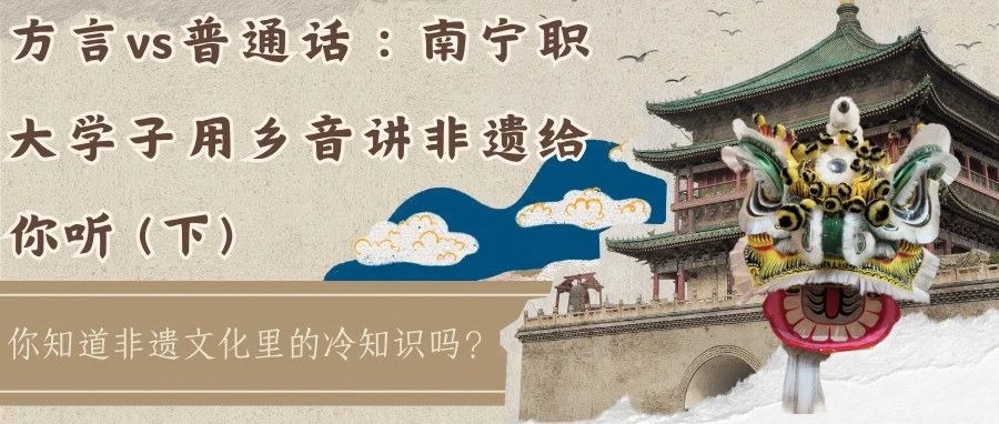 方言 是声音里的 DNA 是非遗的“活芯片” 更是八桂的“气味身份证” 当钦州白话点燃坭兴陶—— “火起咯!靓到冇得弹!” 当梧州骑楼下醒狮炸响—— “狮头起势,威震九街!” 当玉林乡音唤醒芒竹—— “篾影翻飞,一织千年!” 今日 五位“声”林高手 用方言讲述千年技艺 锁定频道 方言 vs 普通话 南宁职大学子用乡音讲非遗给你听!