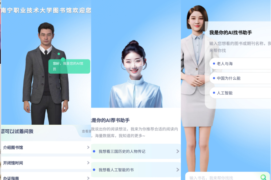 近日,我校教育发展与信息服务中心(图书馆)推出了基于南宁职业技术大学图书馆业务的AI馆员(初级测试版)。读者在线打开“智汇南职”APP移动图书馆应用,就能全新体验南宁职业技术大学AI馆员服务。据了解,该应用搭载Deepseek大模型,深度赋能图书馆场景,能够提供馆藏图书、博看网电子书刊、图书馆公告资讯等资源的一站式知识检索,可根据读者需求、读者咨询,提供个性化图书推荐、智能问答服务,可满足读者在图书馆场景下的...